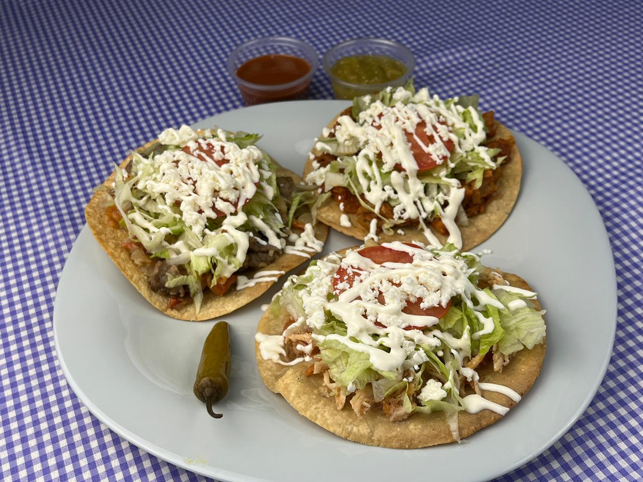 Tortilla de Maiz Tostado Casero, Frijoles Refritos, Lechuga, Tomate, Media Crema, Queso Fresco, Acompañada con salsa verde o Roja + Agua, Elegir relleno de Preferencia: Bistec Ranchero, Carne adobada deshebrada de Res, Tinga de Pollo con Chipotle, o combinados