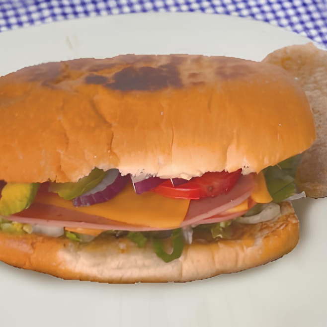 Triple jamón de pavo y Triple queso manchego con lechuga, aguacate, tomate y cebolla, acompañada con chiles en raja.