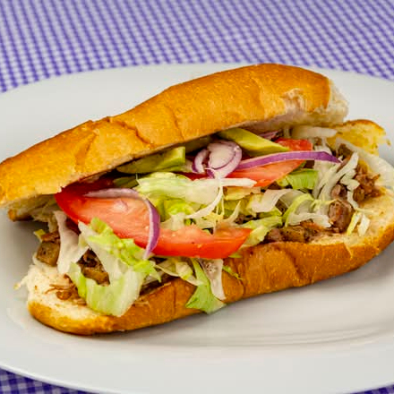 Una torta cubana con jamón, bistec a la mexicana, deshebrada de res, pollo deshebrado, chorizo, salchicha, tocino y queso, con frijoles refritos, lechuga, tomate, aguacate y cebolla morada, acompañada de chiles en raja.