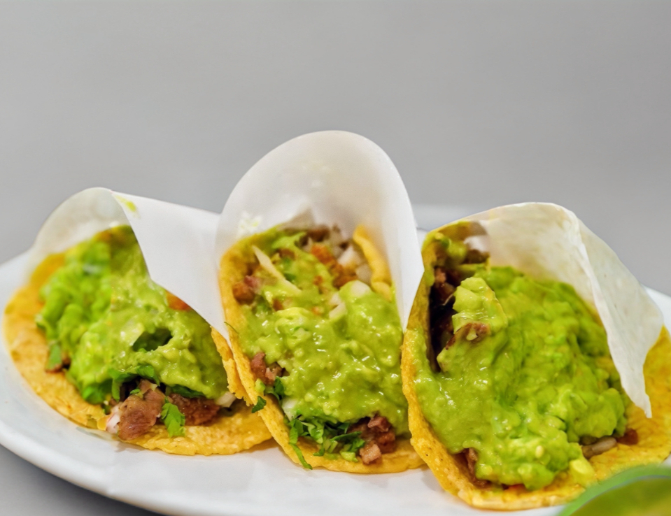 Taco de asada de tortilla normal con frijoles, repollo, salsa habanera, guacamole, salsa roja y chiles asados.