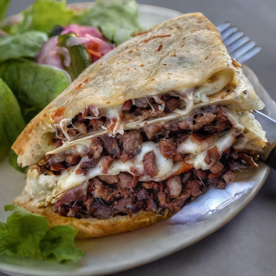 Quesadilla de asada con frijoles, repollo, salsa habanera, guacamole, salsa roja y chiles asados.