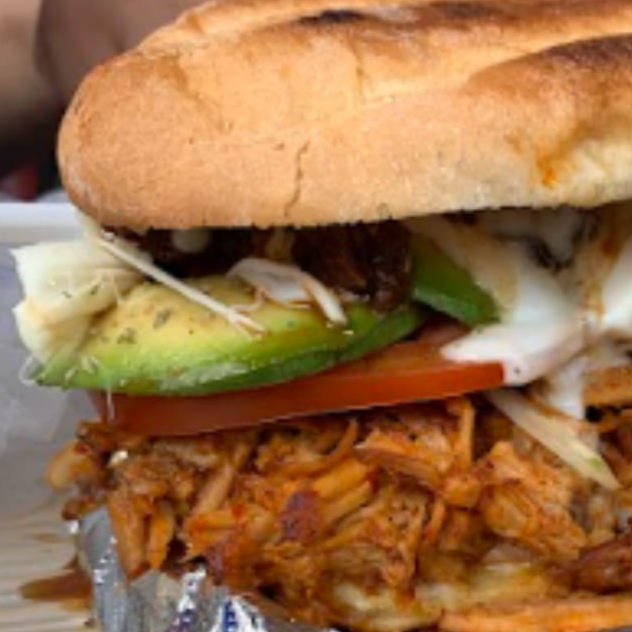 Torta de Jugosa cochinita pibil, con pan artesanal hecho en casa y dorado en mantequilla. Lleva mostaza, tomate, aguacate.