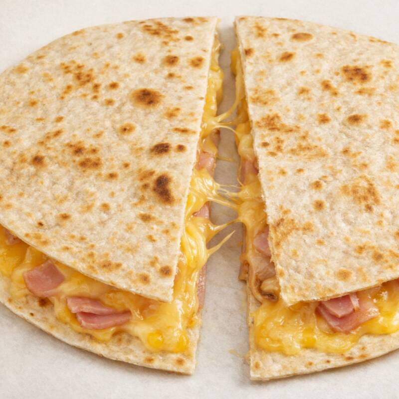 Tortilla de harina hecha en casa, queso monterrey y americano, jamón de pierna. (se envía partida en 2 o como 2 quesadillas)