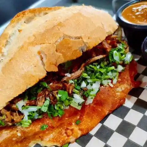 Torta de jugosa birria de puerco, con pan artesanal hecho en casa y dorado en mantequilla. Lleva cebolla y cilantro.