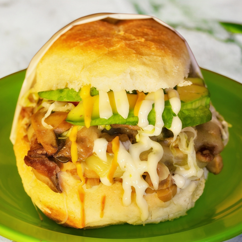 ¿ Has probado esta suculenta combinación? Carne asada a la plancha con champiñones y queso gratinado.Además : lechuga,tomate,aguacate,mayonesa y mostaza.