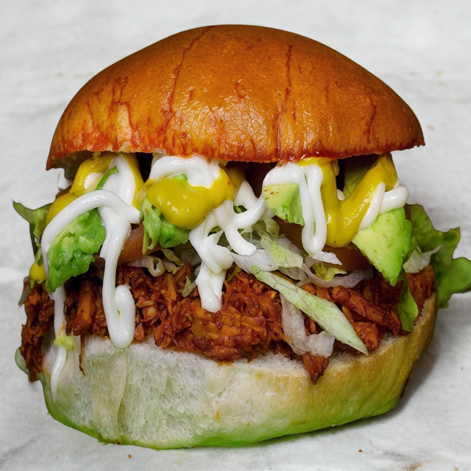 Pierna de pavo desmenuzada que contiene lechuga,tomate,aguacate,mayonesa y mostaza.