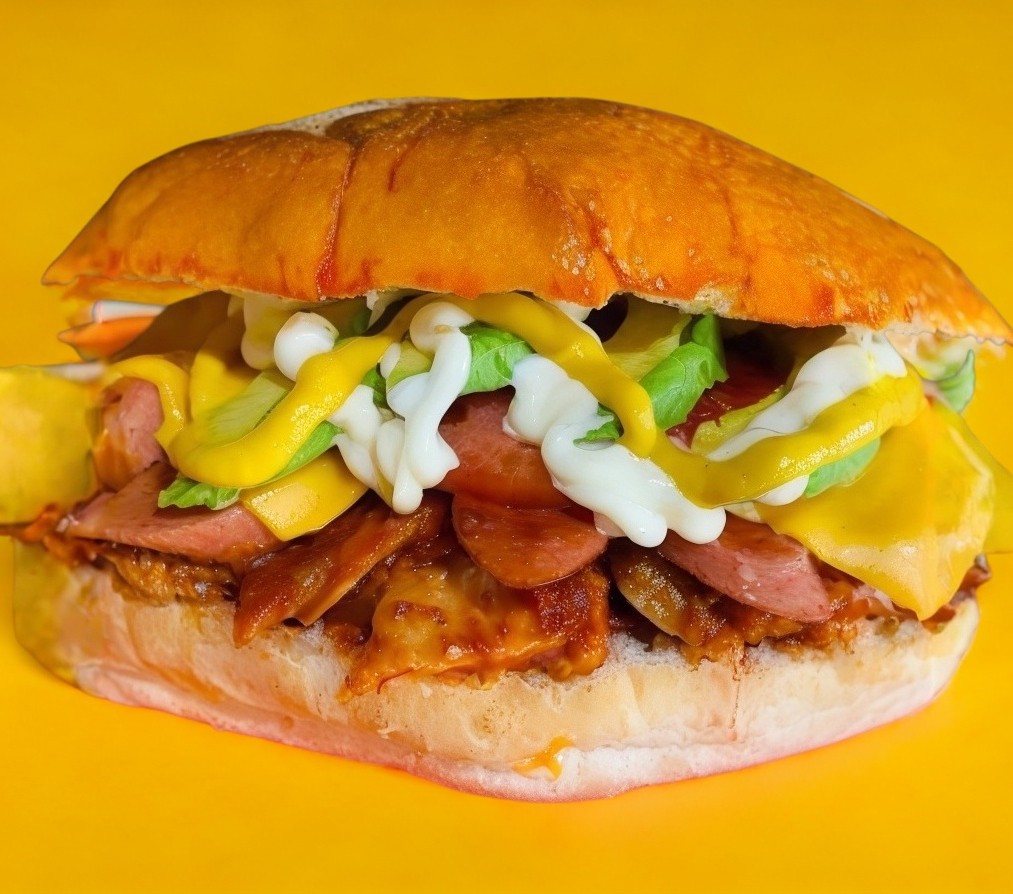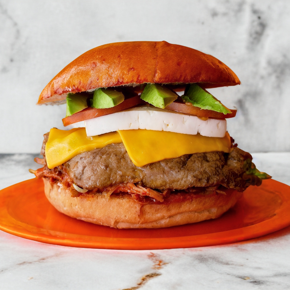 Tradicional hamburguesa de arrachera, jamón y queso amarillo. Además: lechuga,tomate,catsup,mayonesa y mostaza.