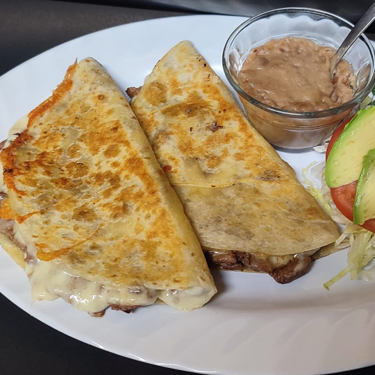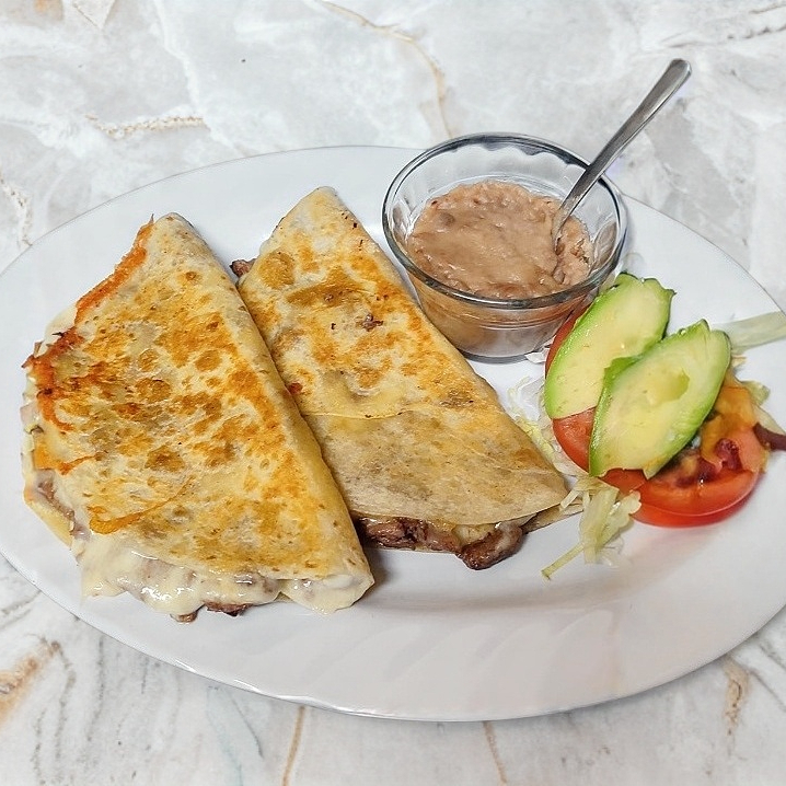 ¡ Pura calidad ! Orden de dos quesadillas de carne asada con tortilla grande. Además : Ensalada fresca,frijoles y salsa.