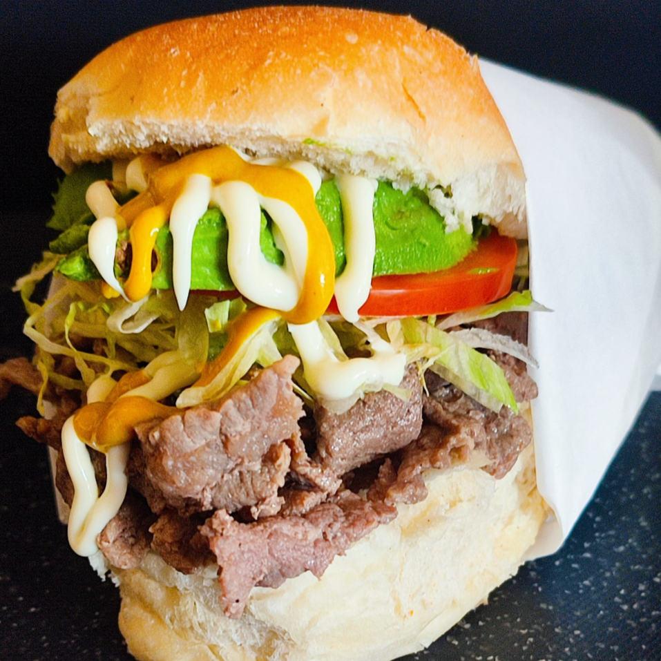 Rica torta de bistec asado a la plancha con lechuga,tomate,aguacate,mayonesa y mostaza.