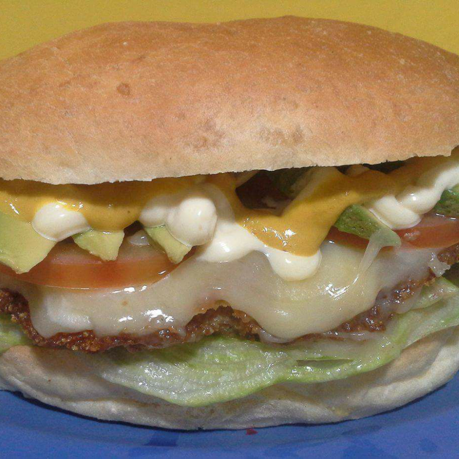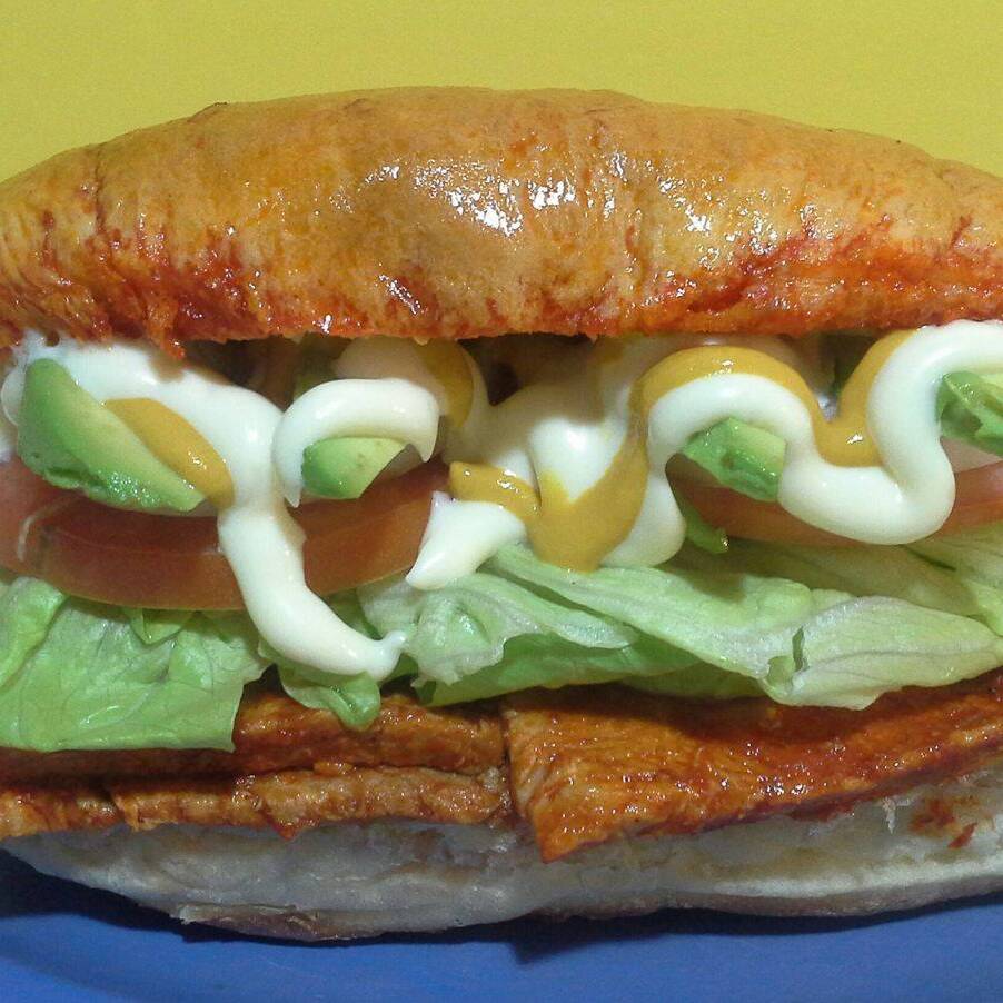 La infaltable y deliciosa torta de milanesa empanizada con lechuga,tomate,aguacate,mayonesa y mostaza.