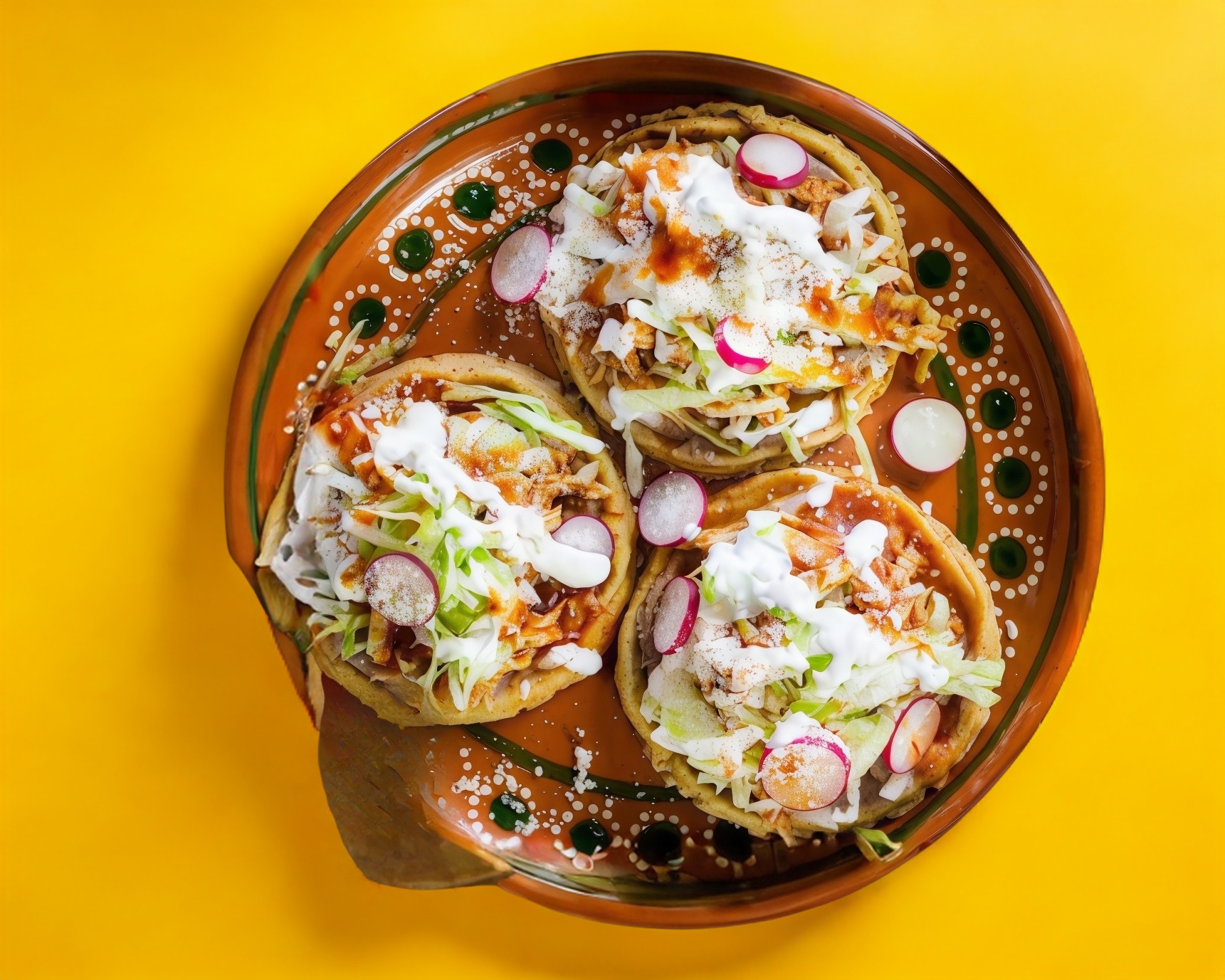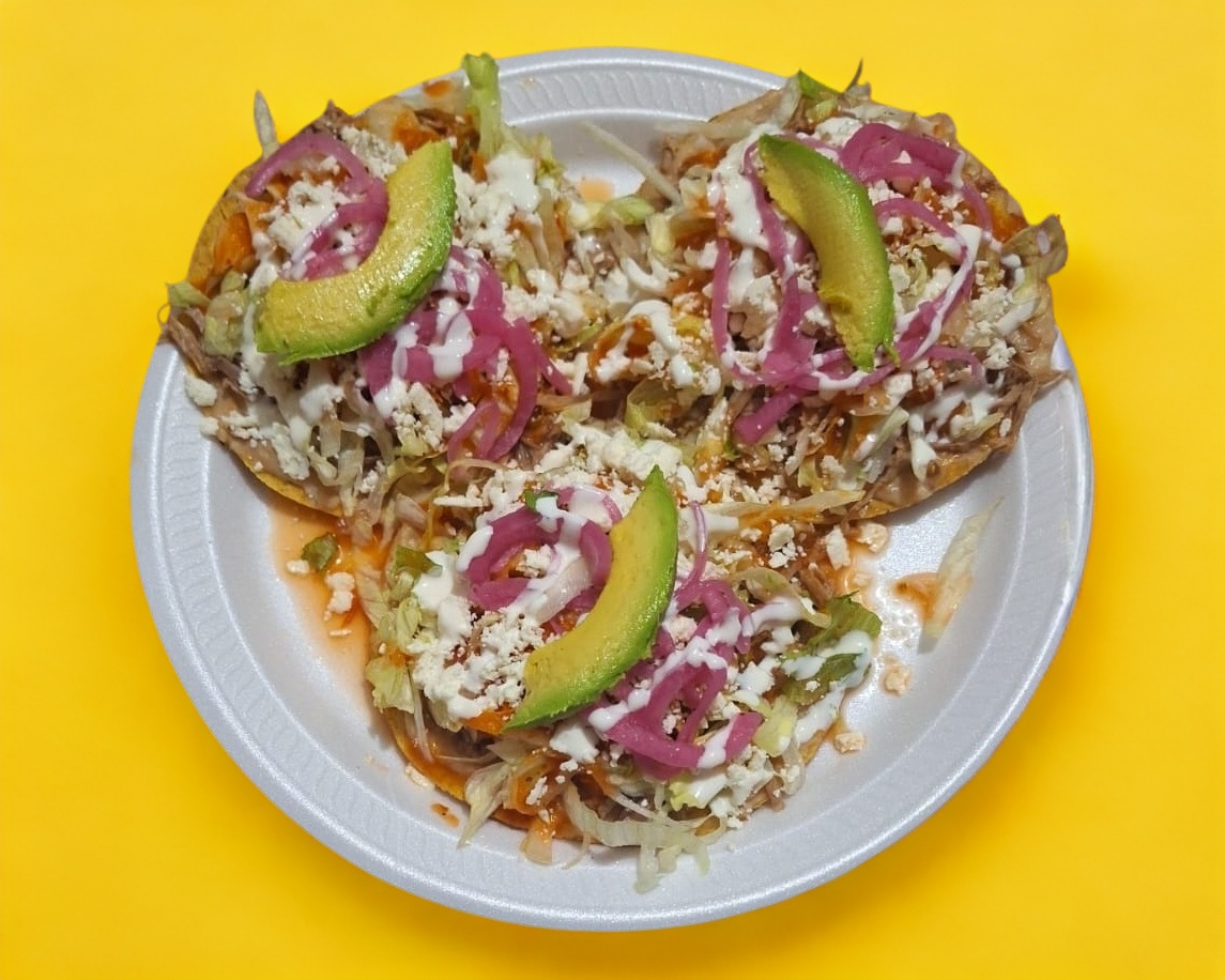 De queso fresco o deshebrada de res, servidas con lechuga, queso rayado, crema, rajas de aguacate y cebolla morada.