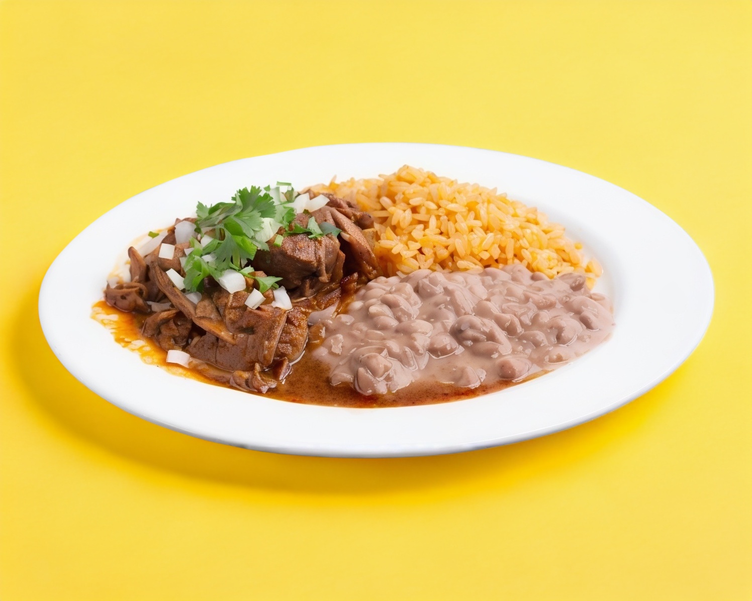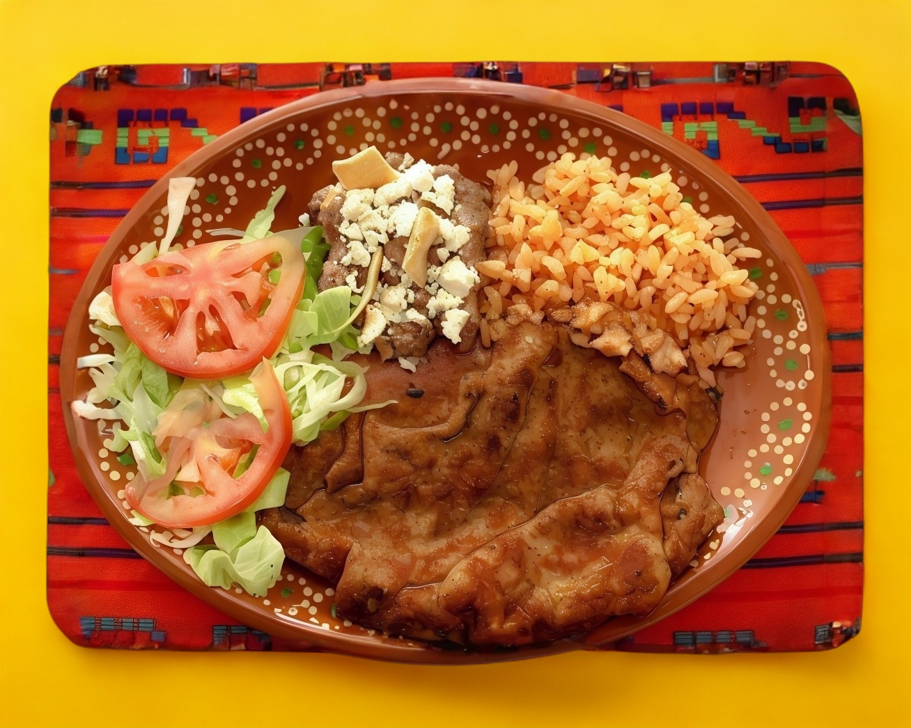 Incluye arroz rojo, ensalada del día, frijol frito, tortillas de harina o maíz.