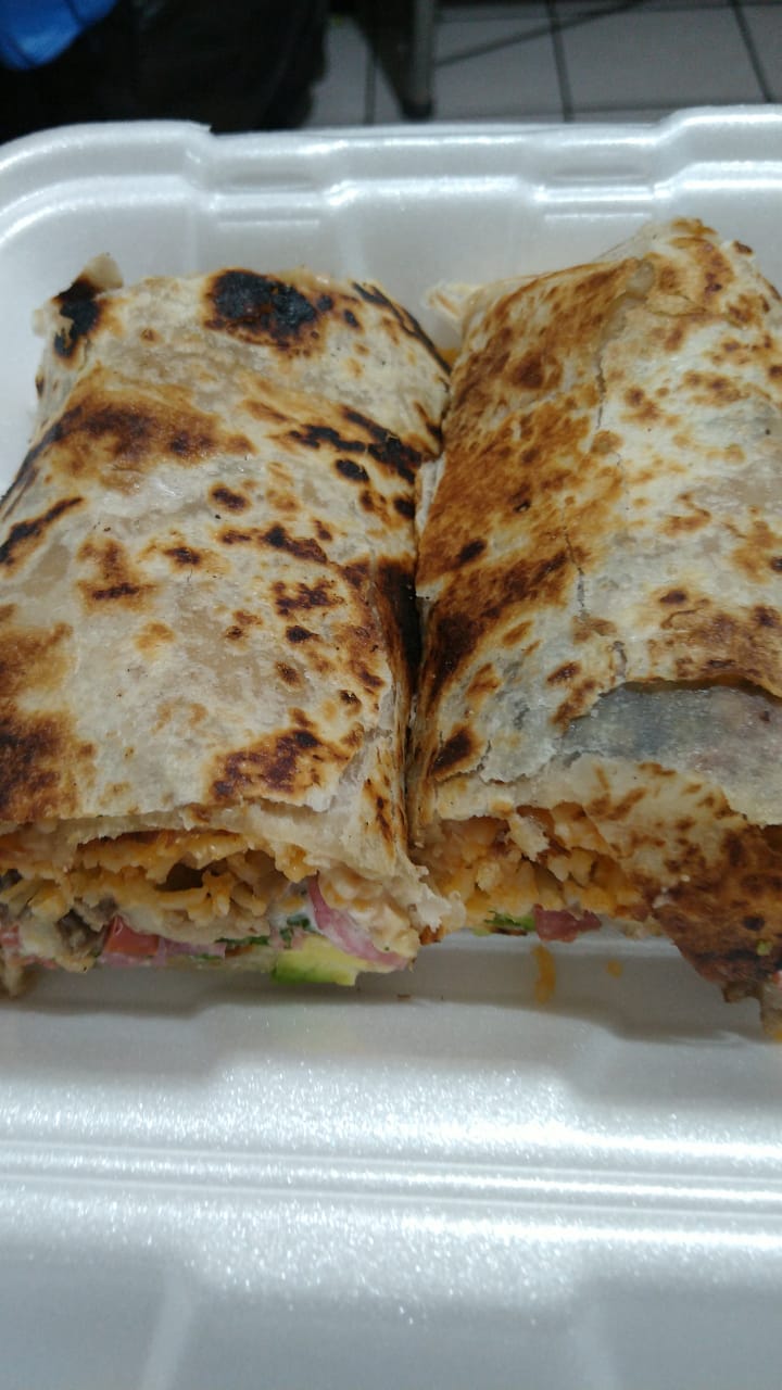 Hecho con tortilla de harina, asada de res, frijol frito, pico de gallo, queso monterrey, crema, arroz y rajas de aguacate.