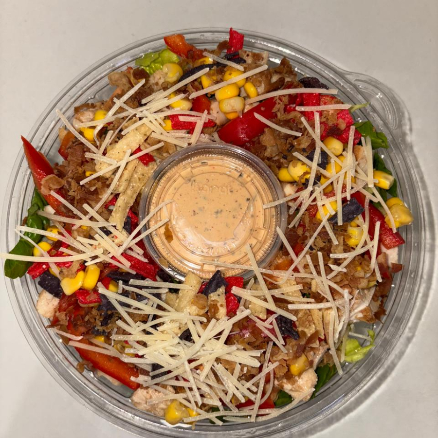 Pollo, lechuga, espinaca, pimiento, elote, tortillitas, tocino, queso parmesano y ranch chipotle