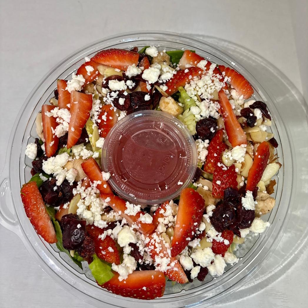 Pollo, lechuga, espinaca, almendras, arándanos, fresas, queso feta y vinagreta de berries