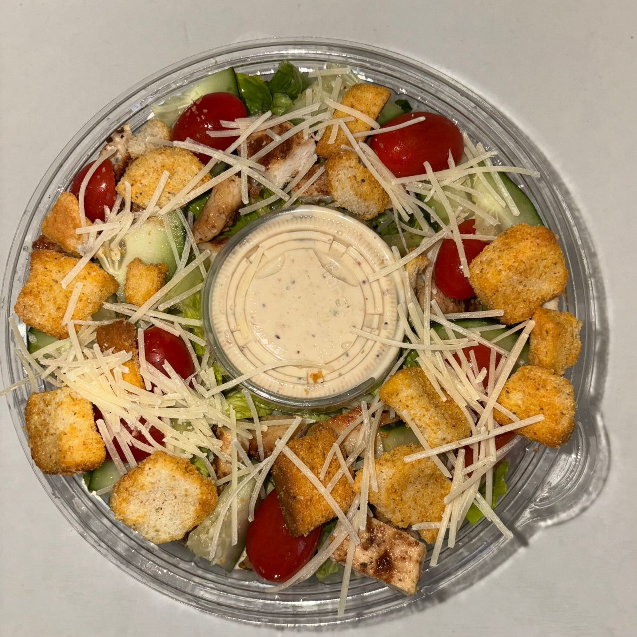 Pollo, lechuga, espinaca, pepino, tomate cherry, crutones, queso parmesano y aderezo cesar