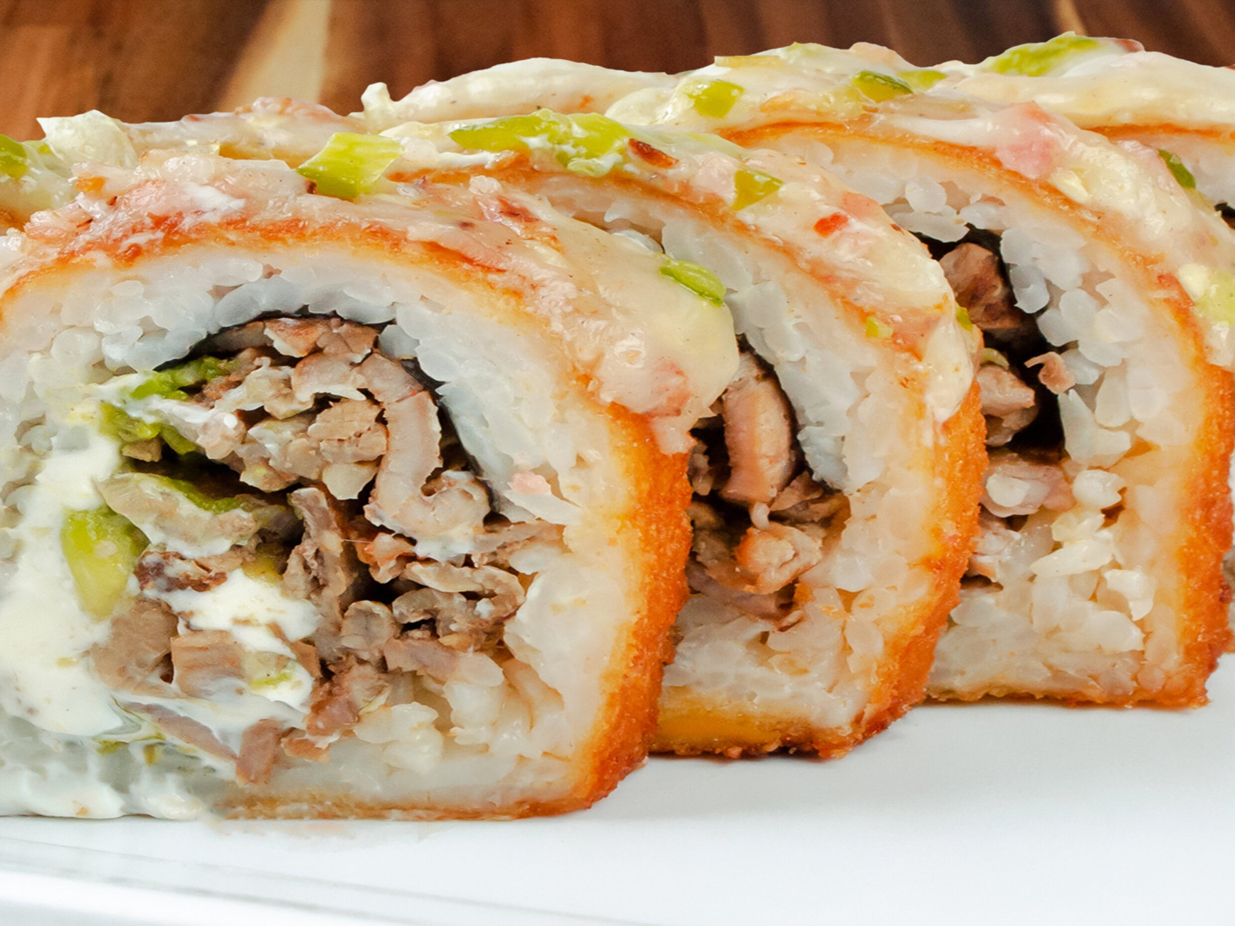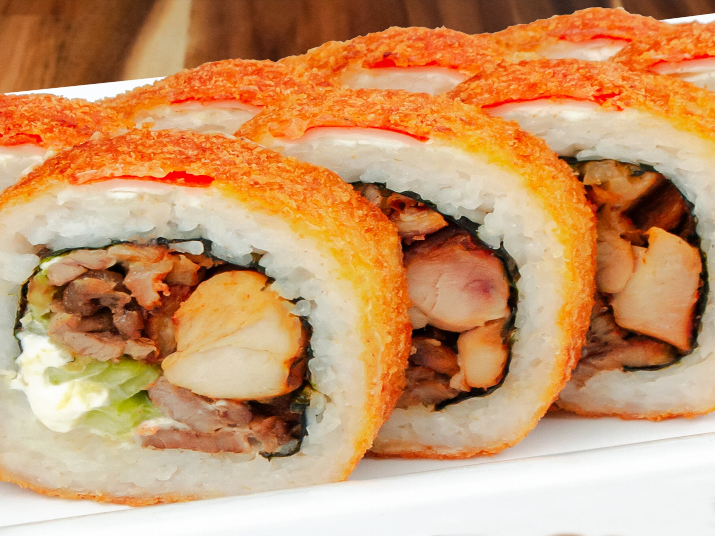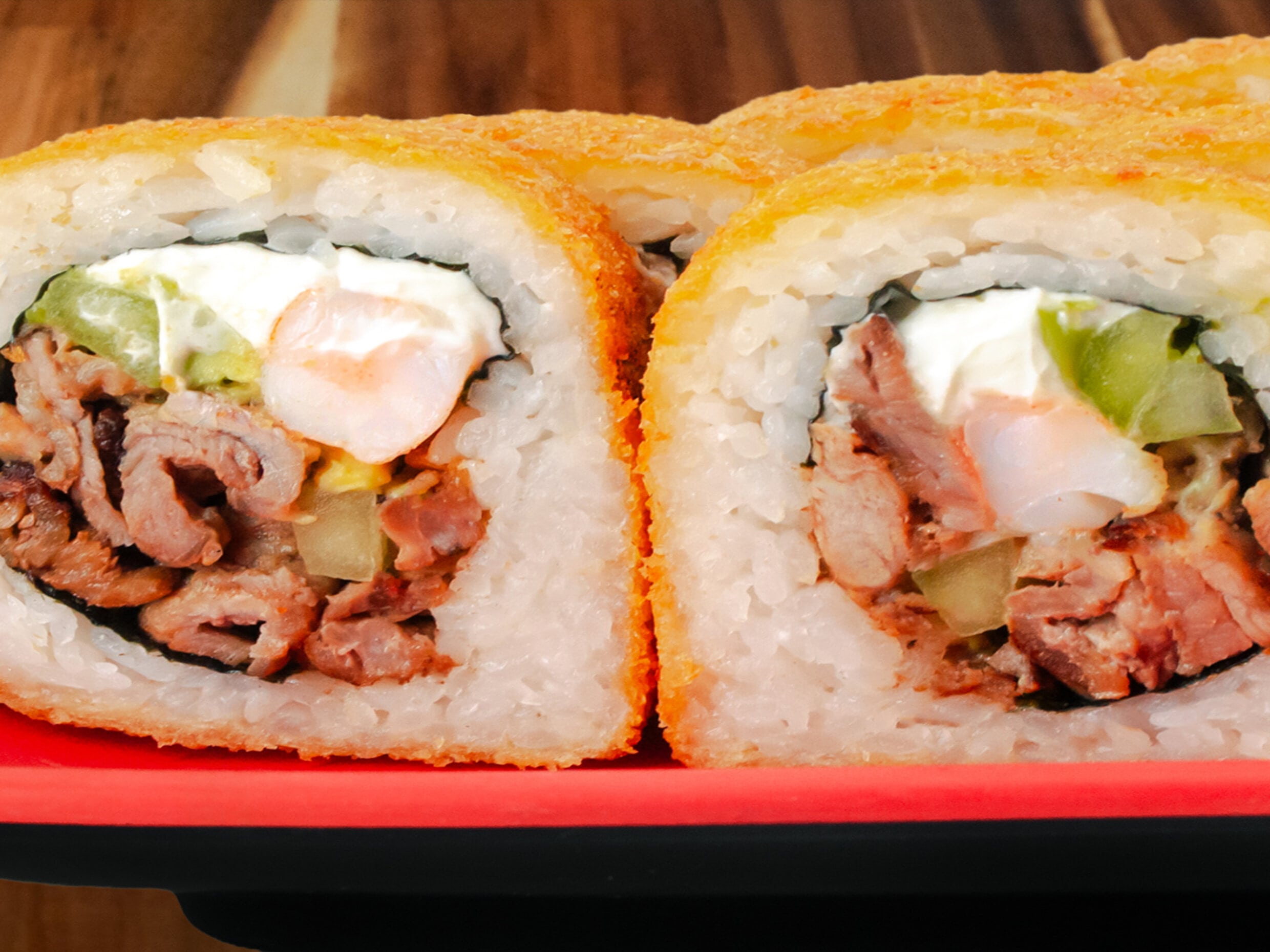 Rollo empanizado relleno de res, pollo y camarón, con queso manchego, toppings de tampico y salsa de anguila. Un festín de sabores.