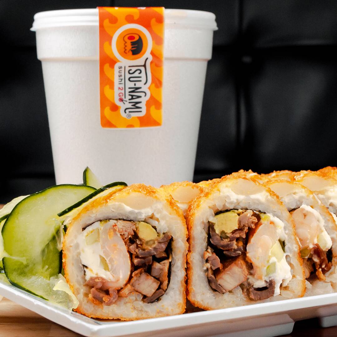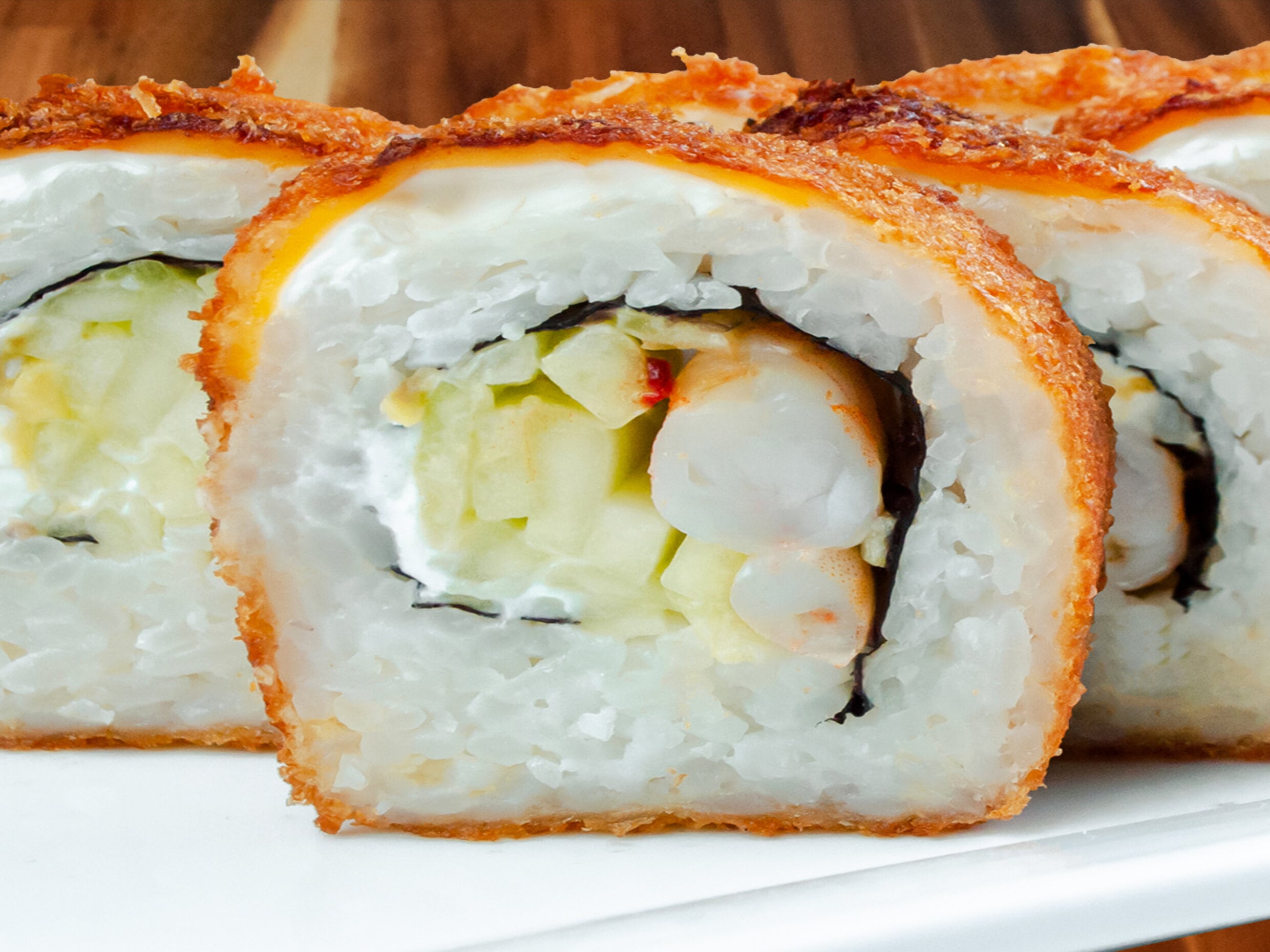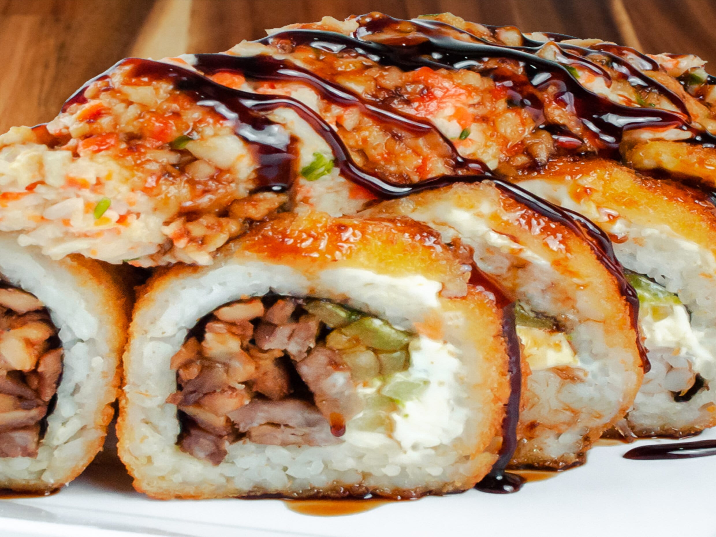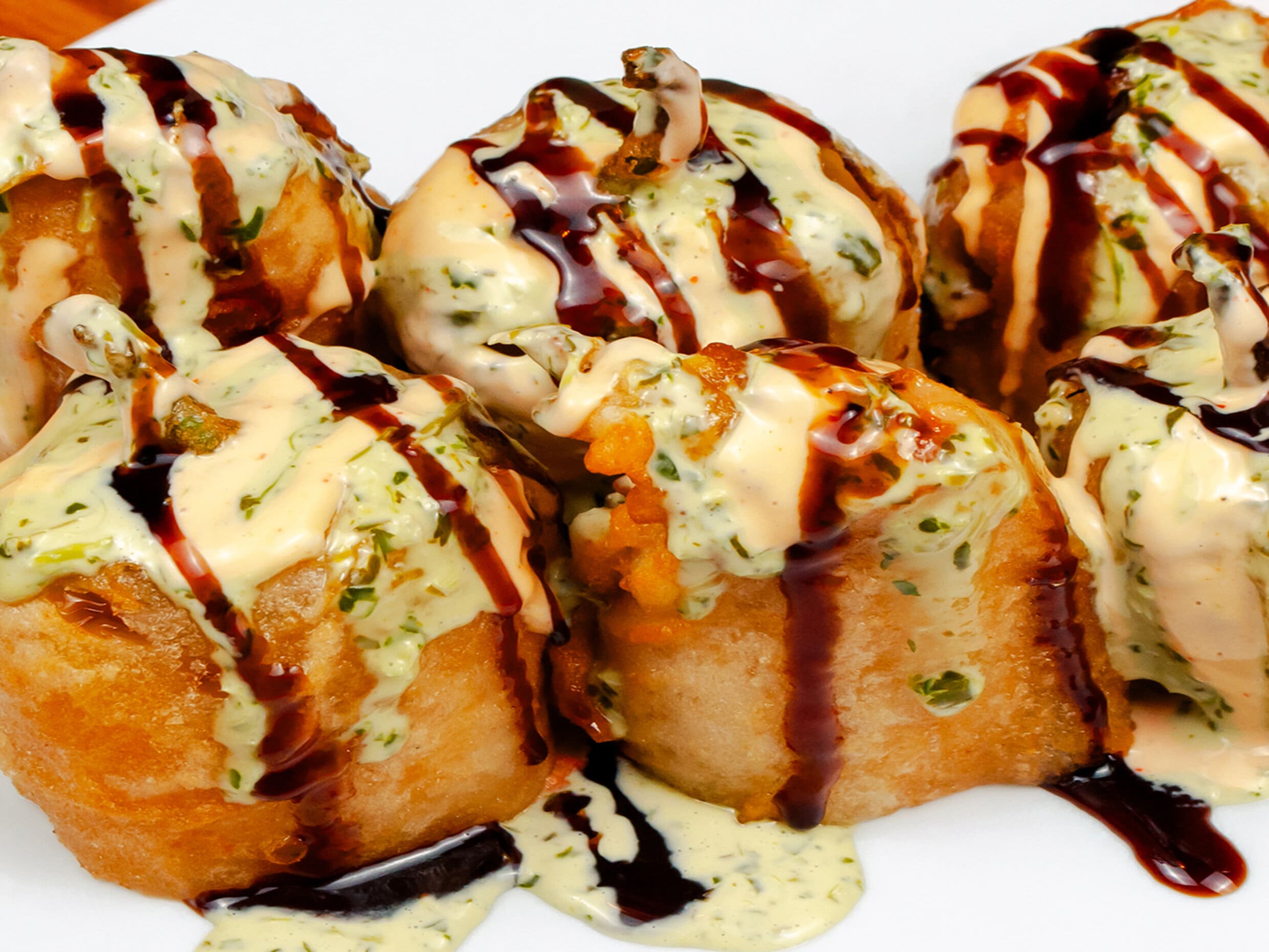 Rollo empanizado relleno de res, pollo y camarón, con queso manchego, toppings de tampico y salsa de anguila. Un festín de sabores.