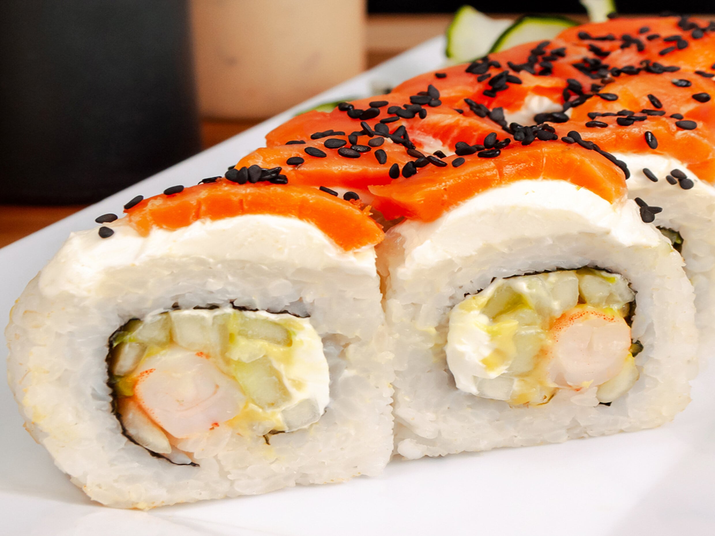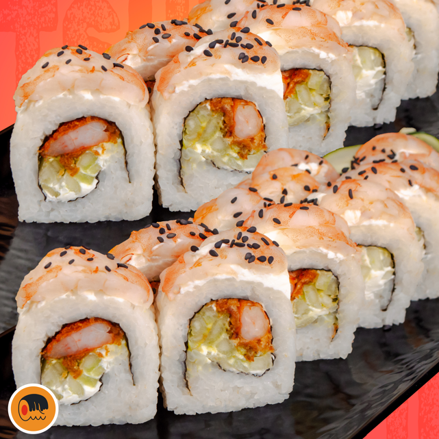 Rollo de camarón natural envuelto en salmón, con un toque de ajonjolí. Un clásico con un toque especial.