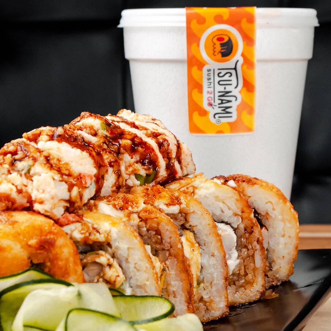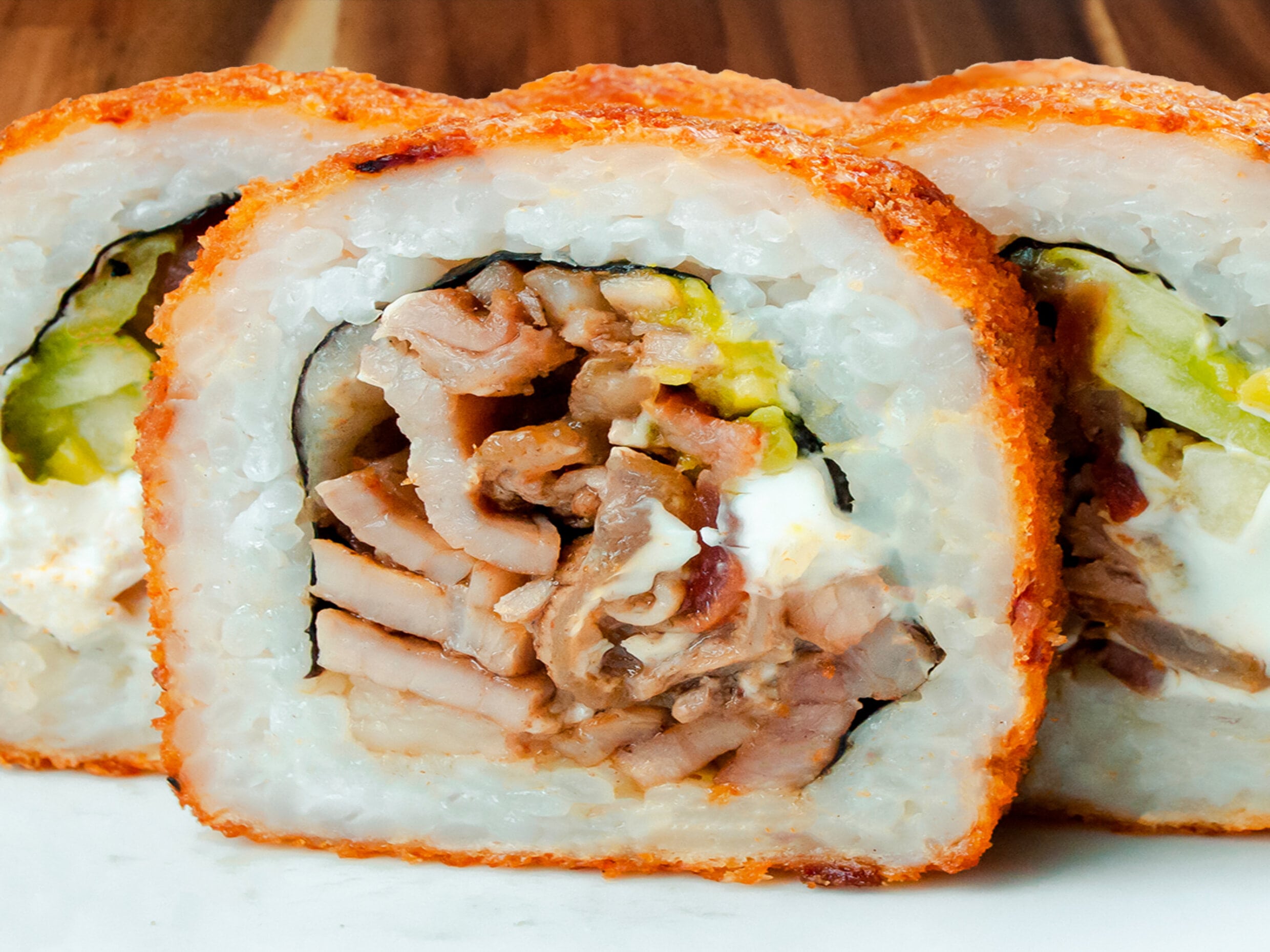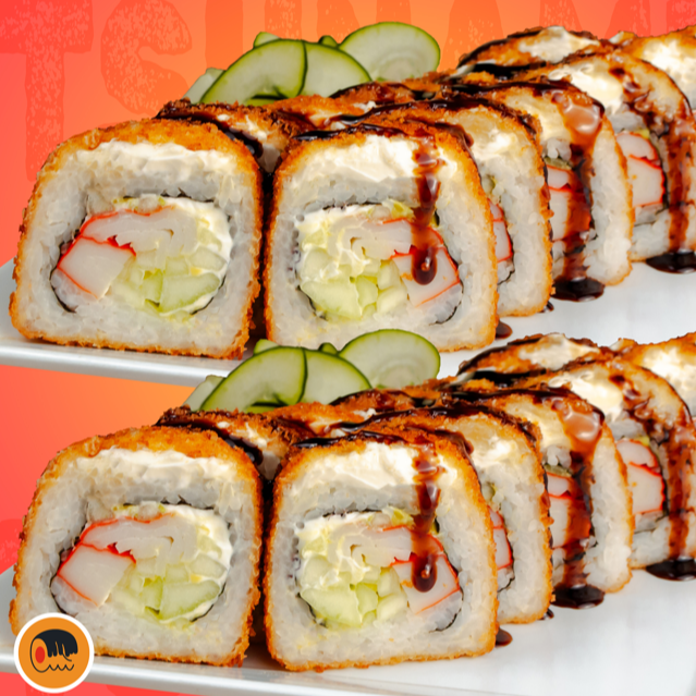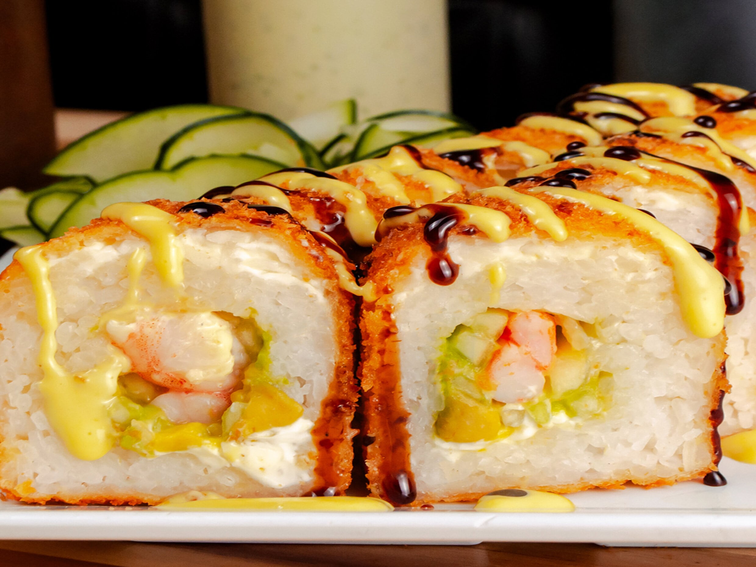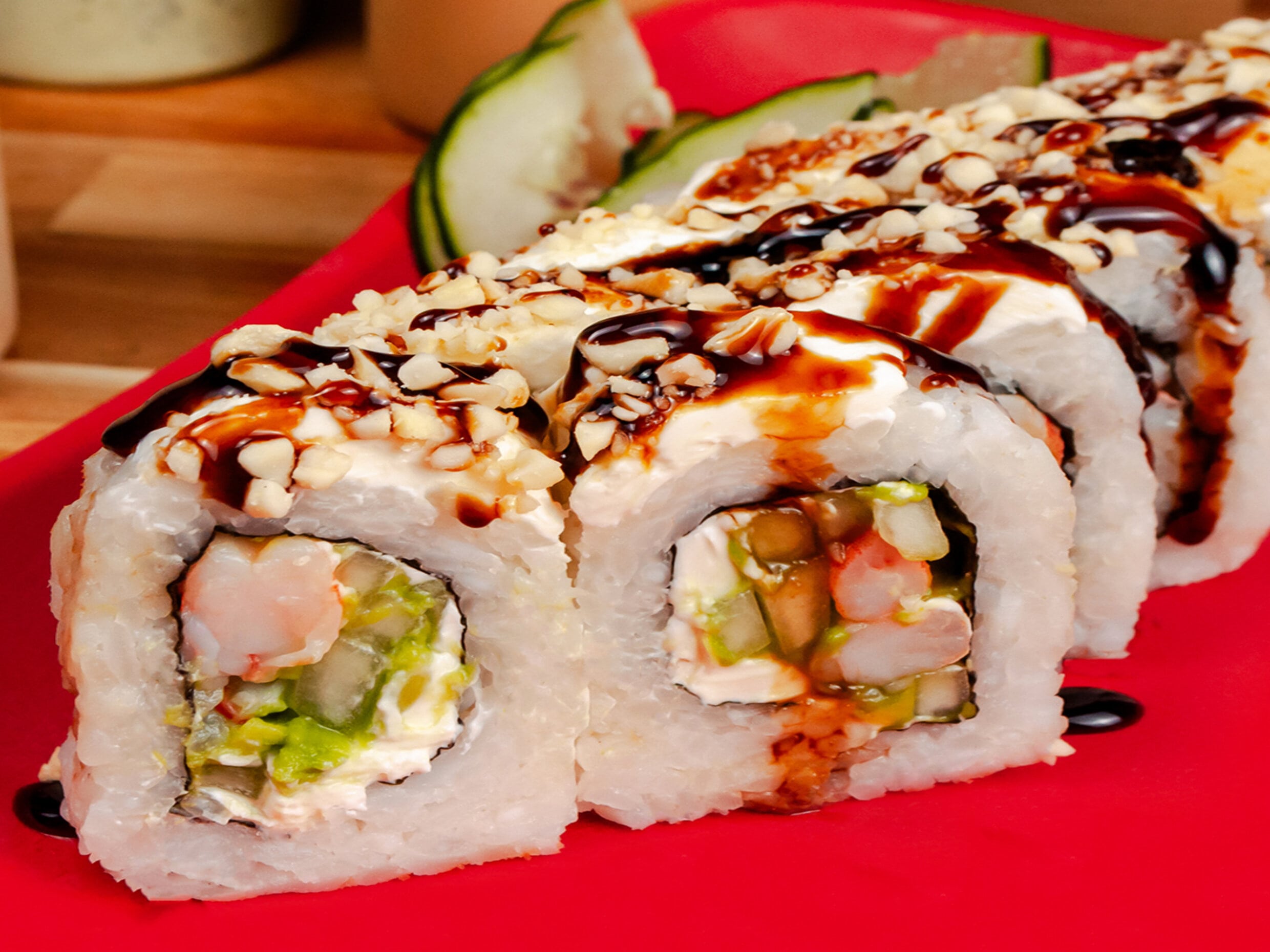 Rollo empanizado relleno de res, pollo, camarón, forrado de queso manchego, enrollado en tocino, topping de tampico bañado en salsa anguila y un toque de ajonjolí.