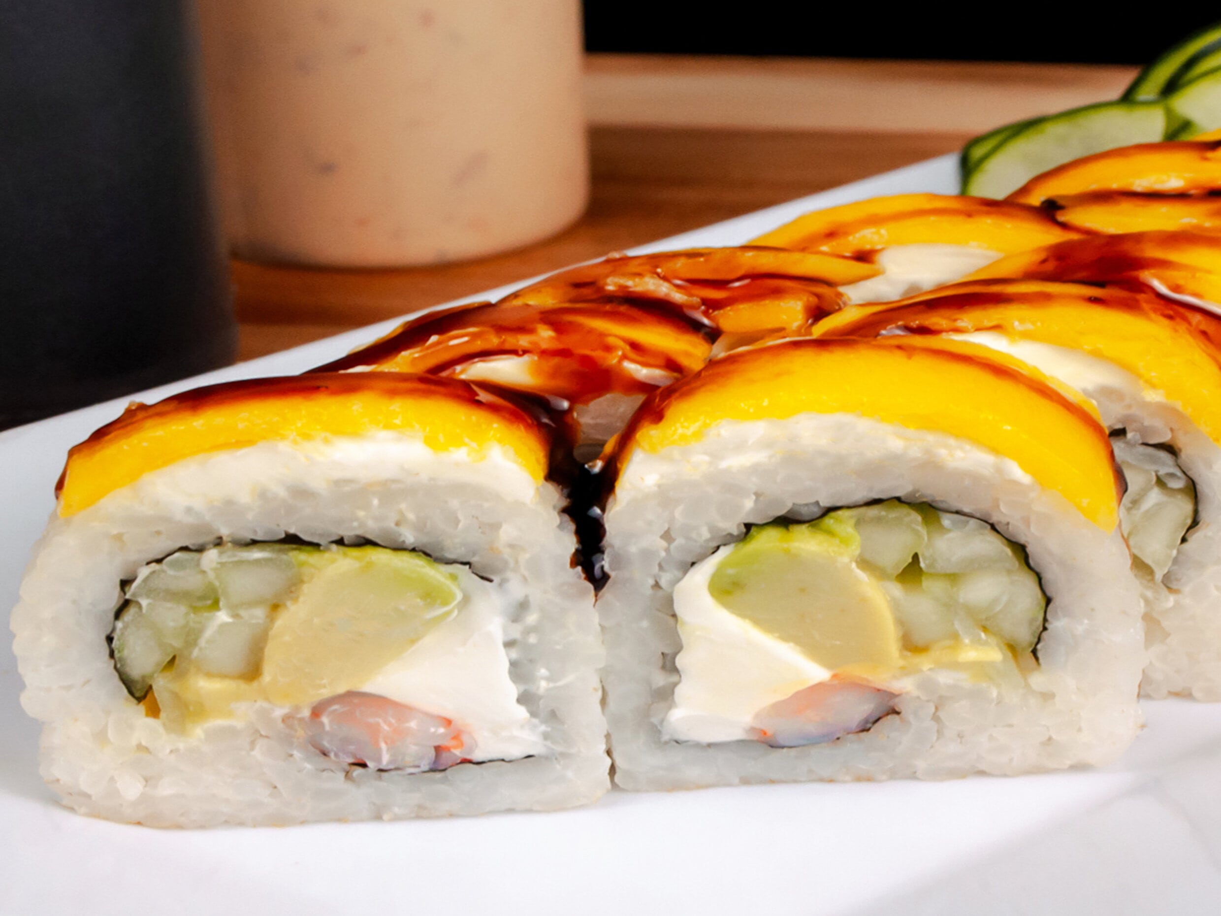 Rollo de camarón envuelto en mango, bañado en salsa de anguila. Una combinación dulce y salada.