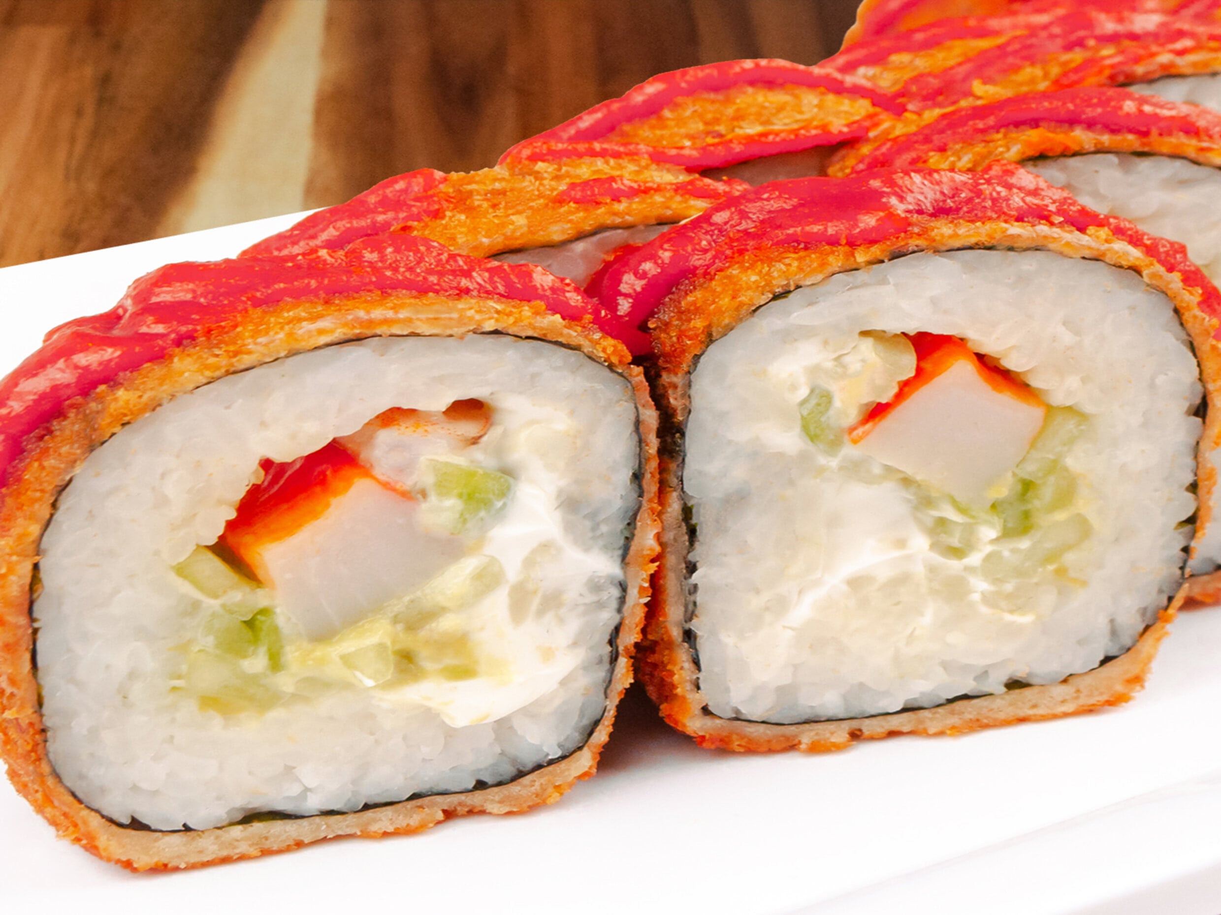 Relleno de cangrejo y camarón, alga por fuera bañado en siracha.