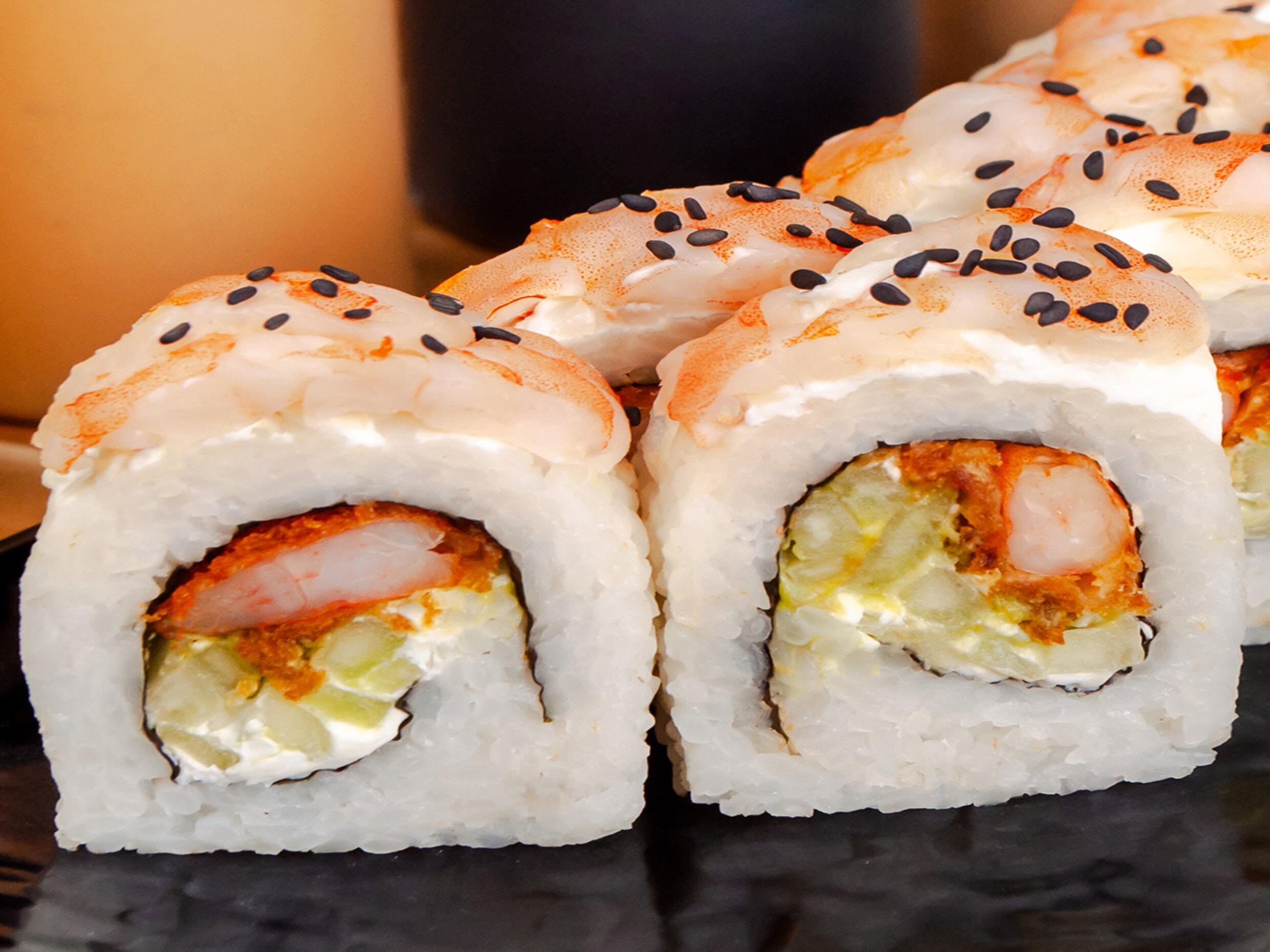Rollo con camarón forrado de queso crema, topping de tampico y ajonjolí de la cas