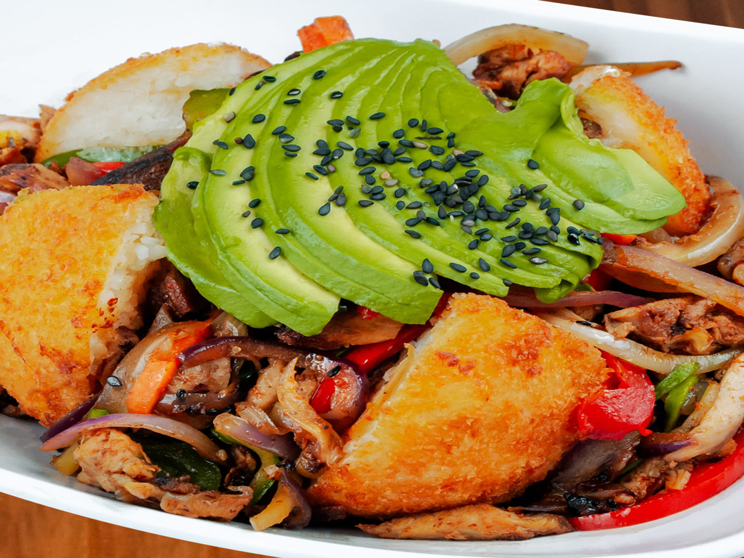 Bola de Arroz con toppings de fajitas a la plancha con verduras mixtas
