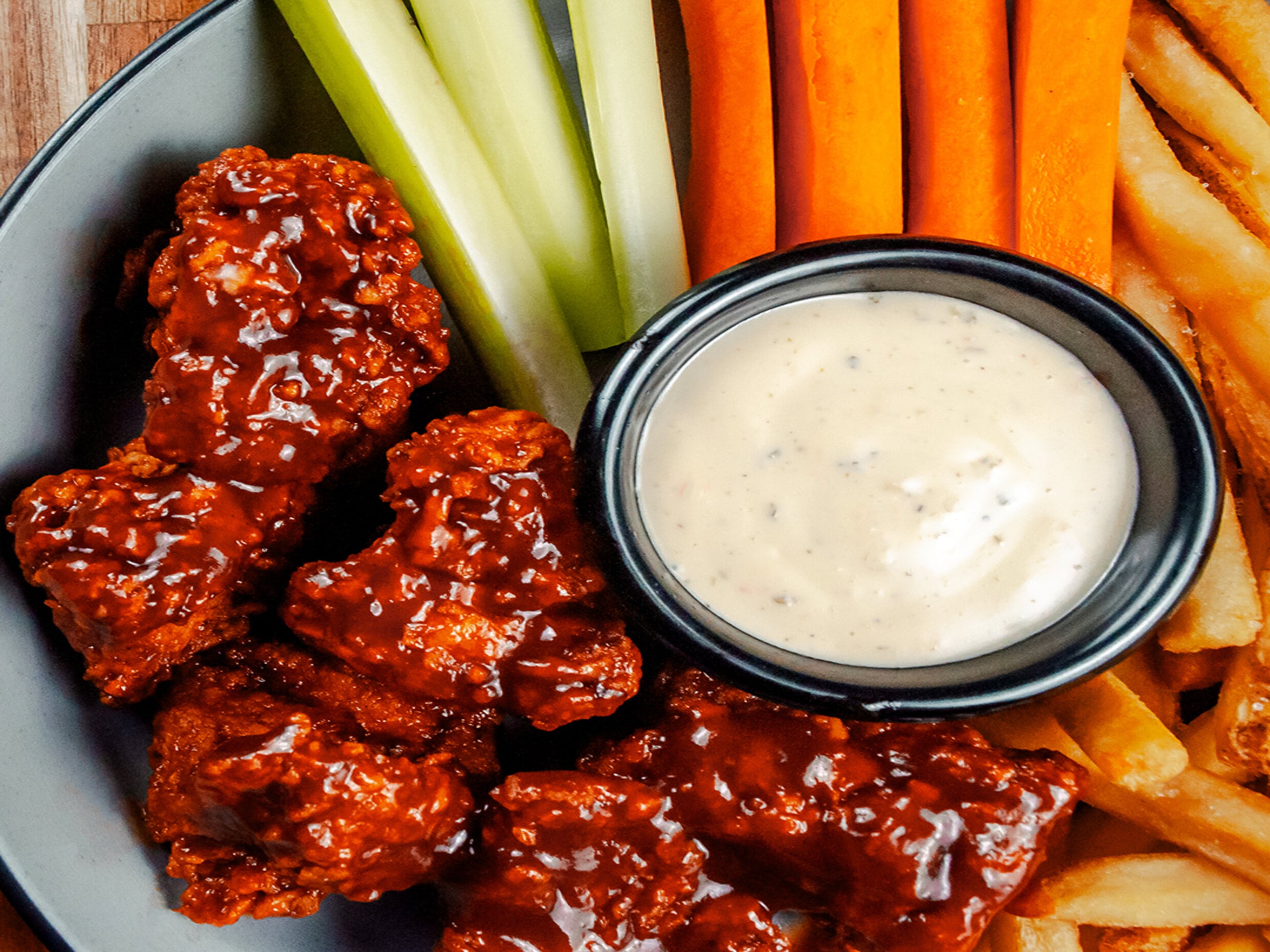 Papas francesas, 6 boneless acompañados de salsa ranch con zanahoria y apio. Elige un sabor: búfalo, BBQ o mango habanero.