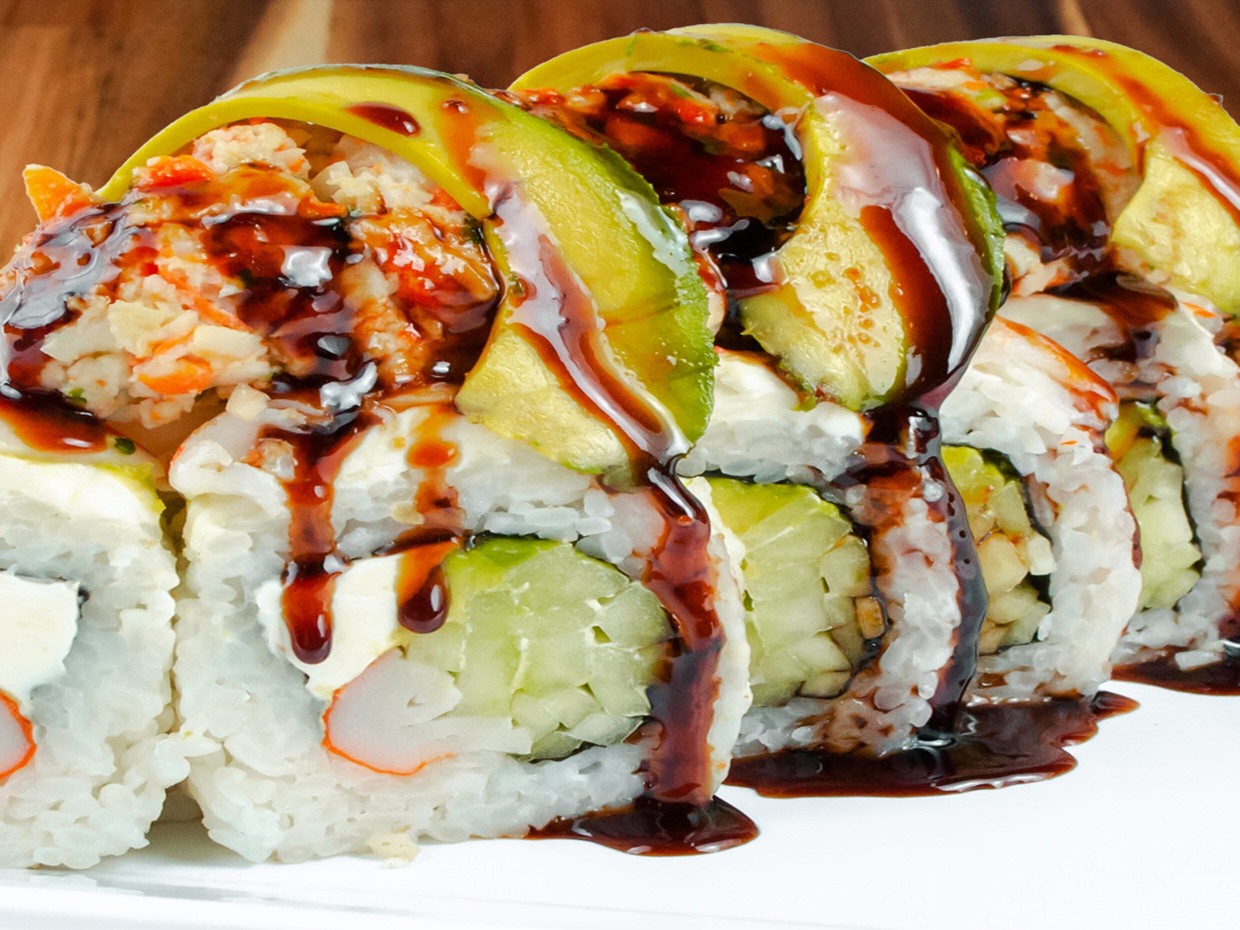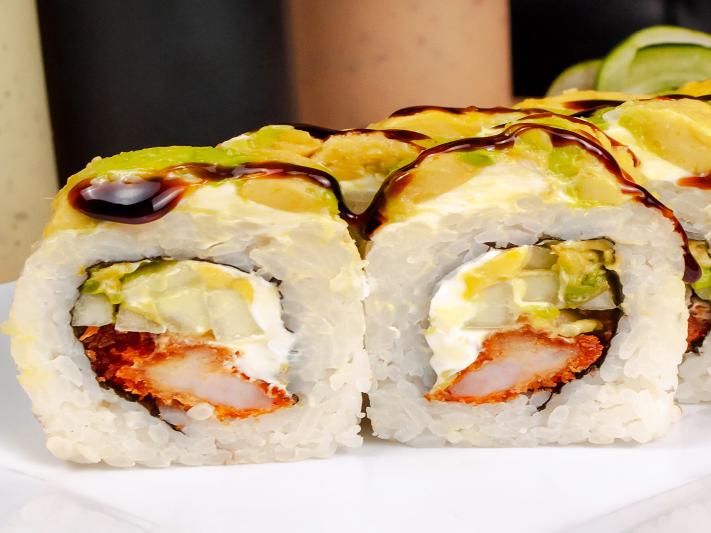 Rollo de camarón empanizado envuelto en aguacate, bañado en salsa de anguila. Una opción fresca y crujiente.