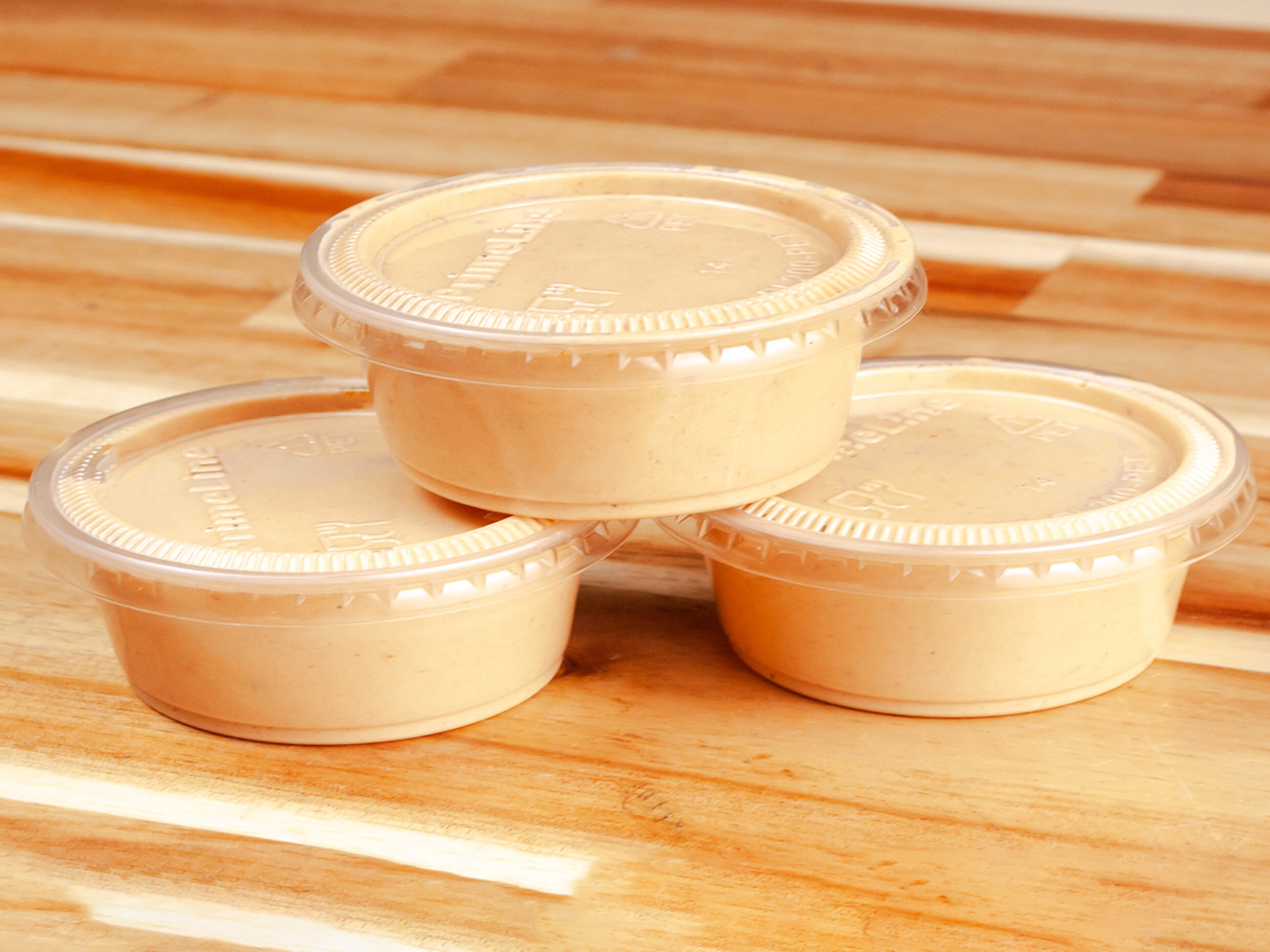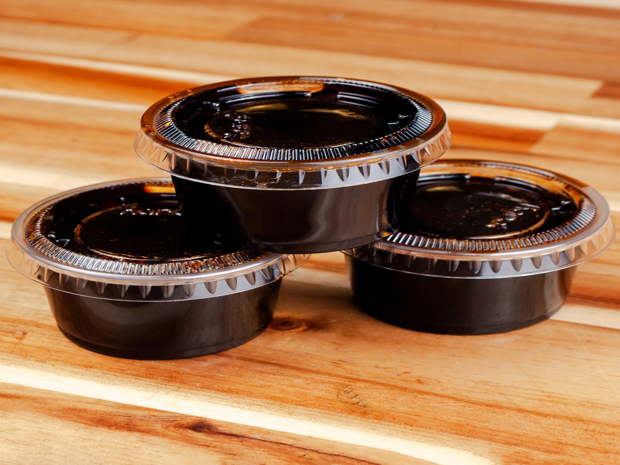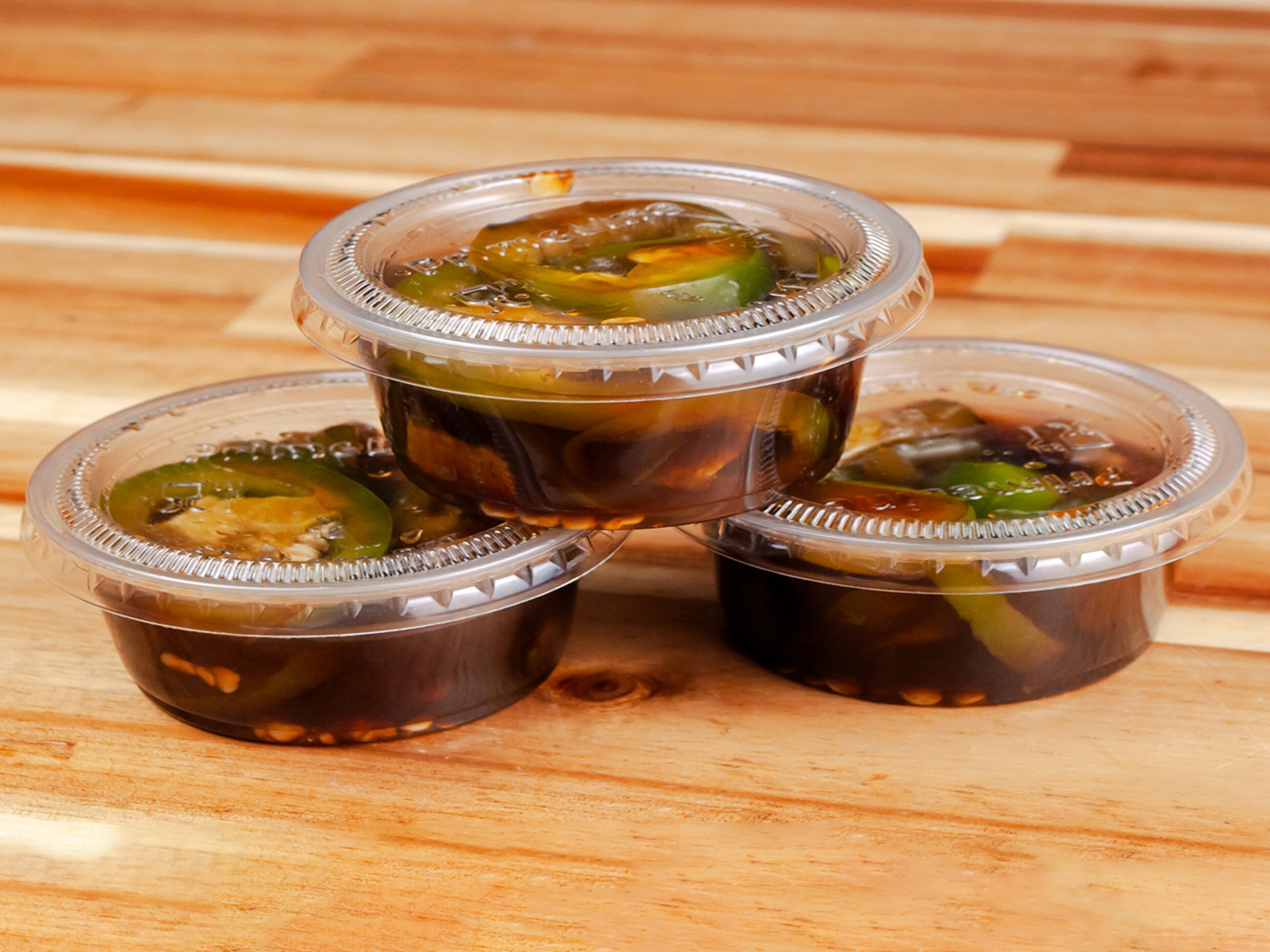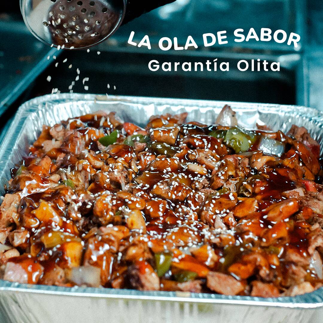 Charola de teriyaki de pollo chica para 4-5 personas, acompañado de aderezo chipotle grande y chilitos grandes.