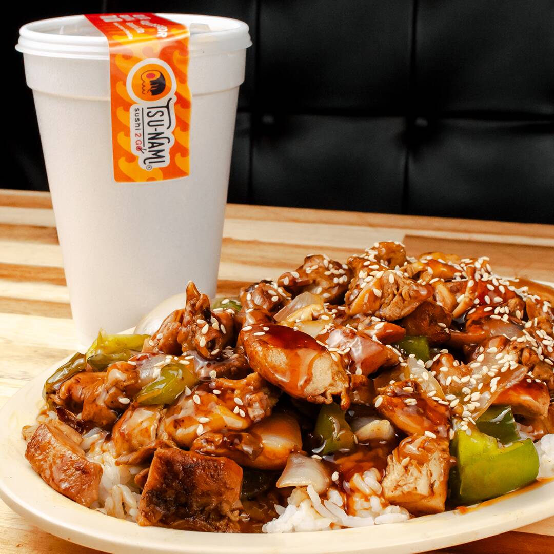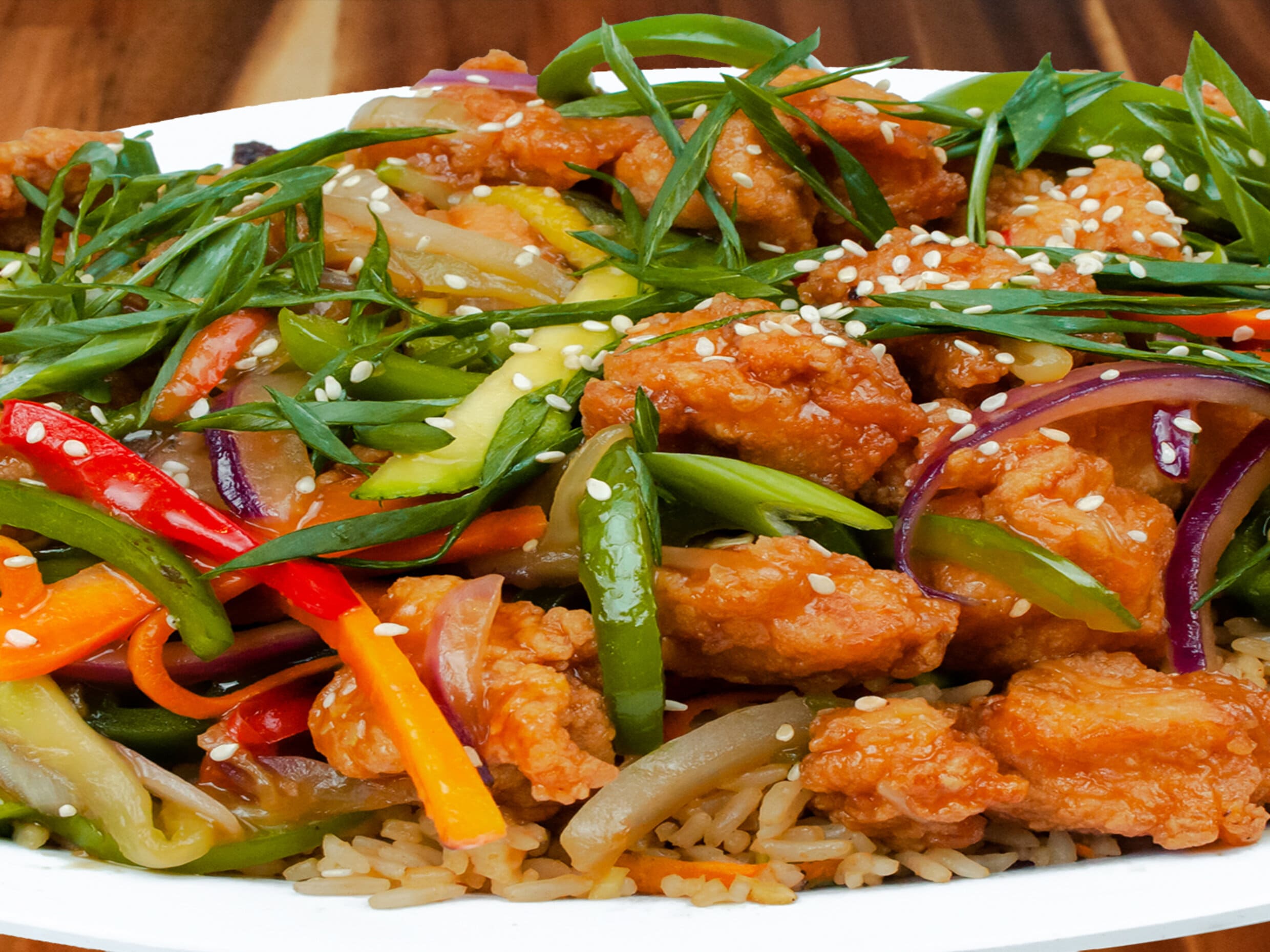 Teriyaki de pollo crujiente sobre una cama de arroz blanco acompañado de verduras a la mantequilla con un toque de jalapeño y cebollín.