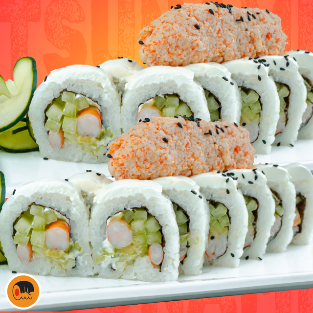 Rollo de surimi envuelto en cangrejo y camarón, con toppings de tampico y aguacate. Sabores marinos bien combinados.