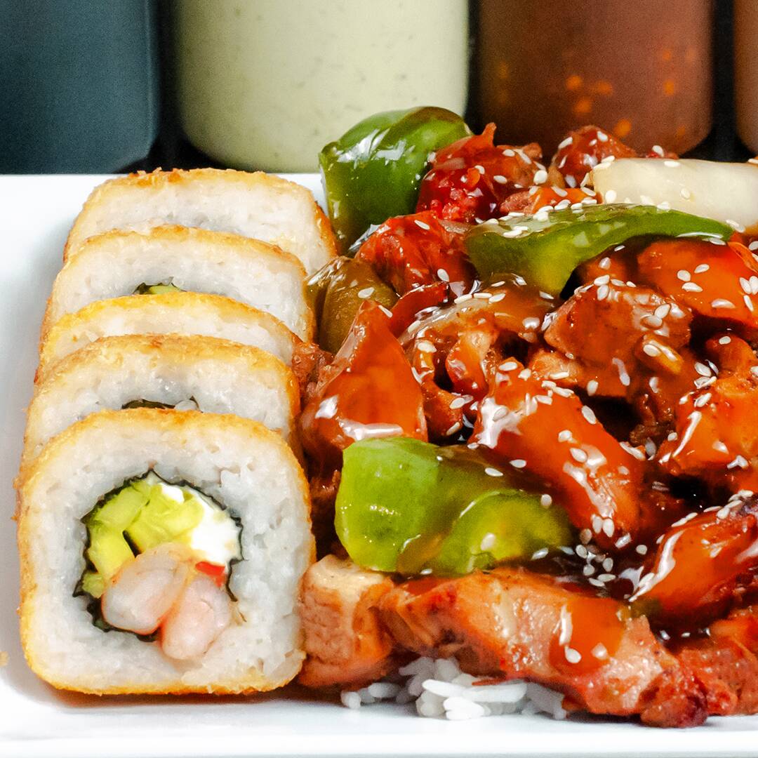 Medio California Roll acompañado de media porción de nuestro delicioso Teriyaki de pollo. Pide el rollo natural o empanizado