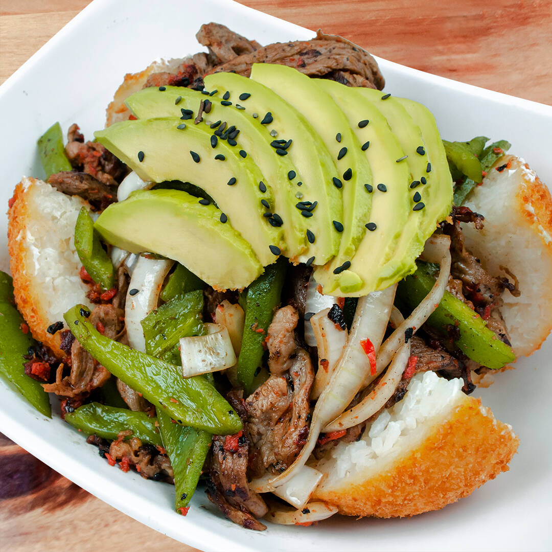 Bola de arroz empanizada rellena de queso crema acompañada de aguacate con un toque de ajonjolí. Topping de fatigas de res guisado con verduras mixtas a la mantequilla.