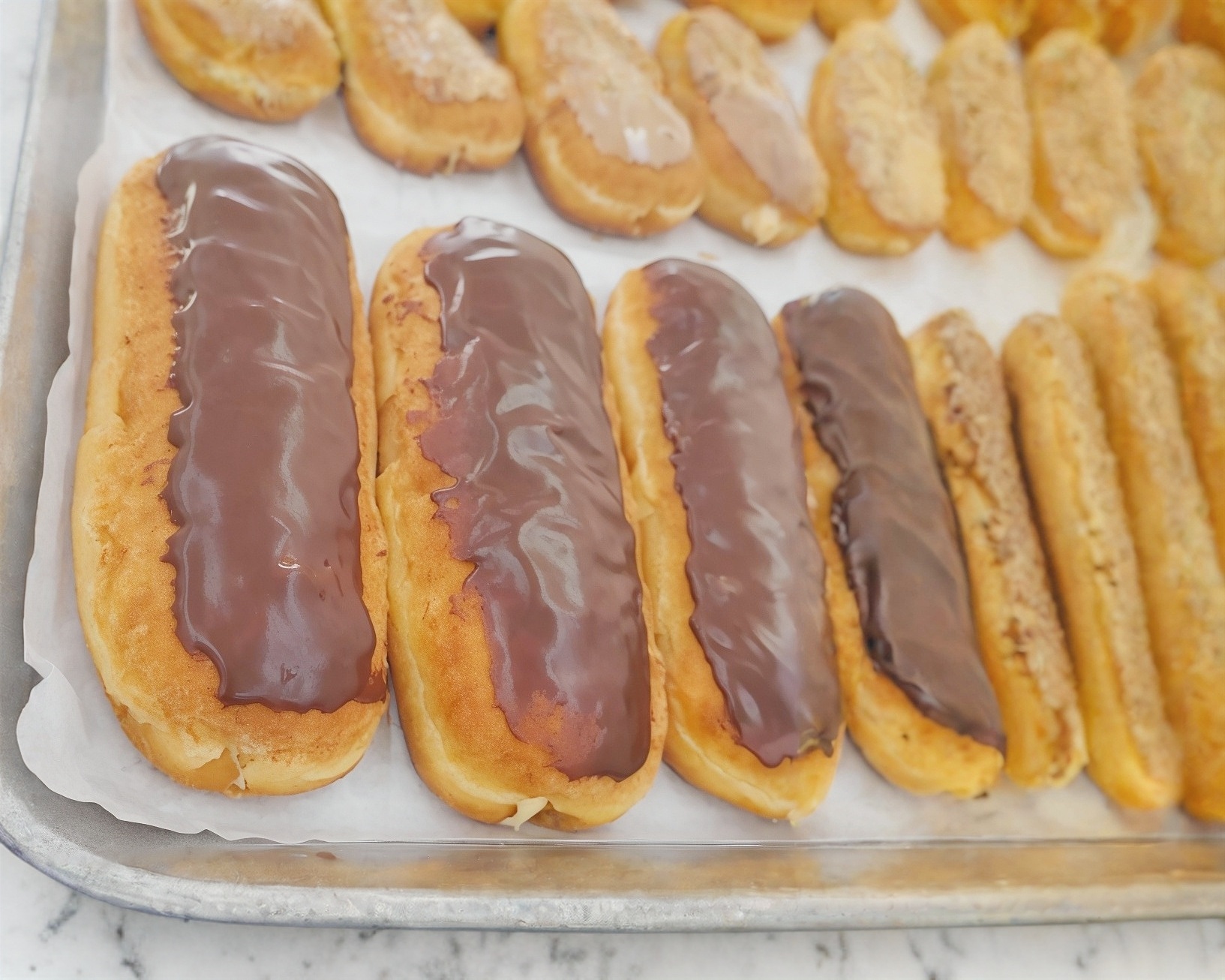 Deliciosa barra de pan a base de harina de dona rellena de crema dulce tipo pastelera con cobertura a elegir, 1 pza.