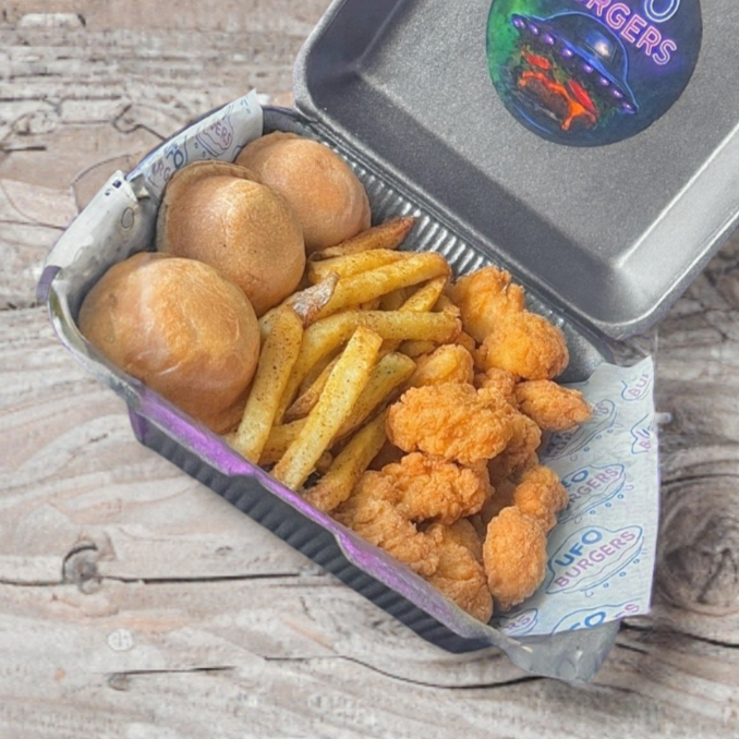 HAMBURGUESA EN FORMA DE OVNI RELLENA DE BONELESS DE POLLO NATURALES O BAÑADOS EN SALSA BBQ O BUFALO, DOBLE QUESO AMERICANO, LECHUGA, TOMATE, CEBOLLA, PEPINILLOS, ADEREZO DE LA CASA, MOSTAZA Y CATSUP. ACOMPAÑADOS DE PAPAS FRITAS O AROS DE CEBOLLA.