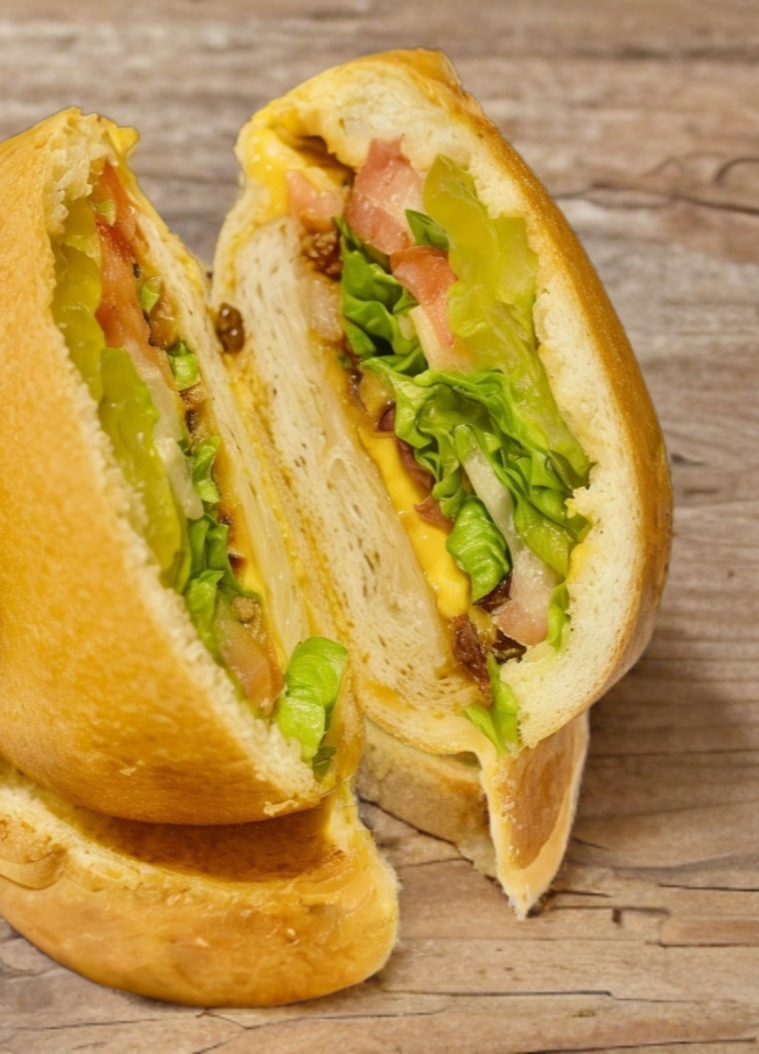 HAMBURGUESA EN FORMA DE OVNI RELLENA DE CARNE MOLIDA DE RES, SALCHICHA DE PAVO, TOCINO, DOBLE QUESO AMERICANO, LECHUGA, TOMATE, CEBOLLA, PEPINILLOS, ADEREZO DE LA CASA, MOSTAZA Y CATSUP. ACOMPAÑADA DE PAPAS FRITAS O AROS DE CEBOLLA.