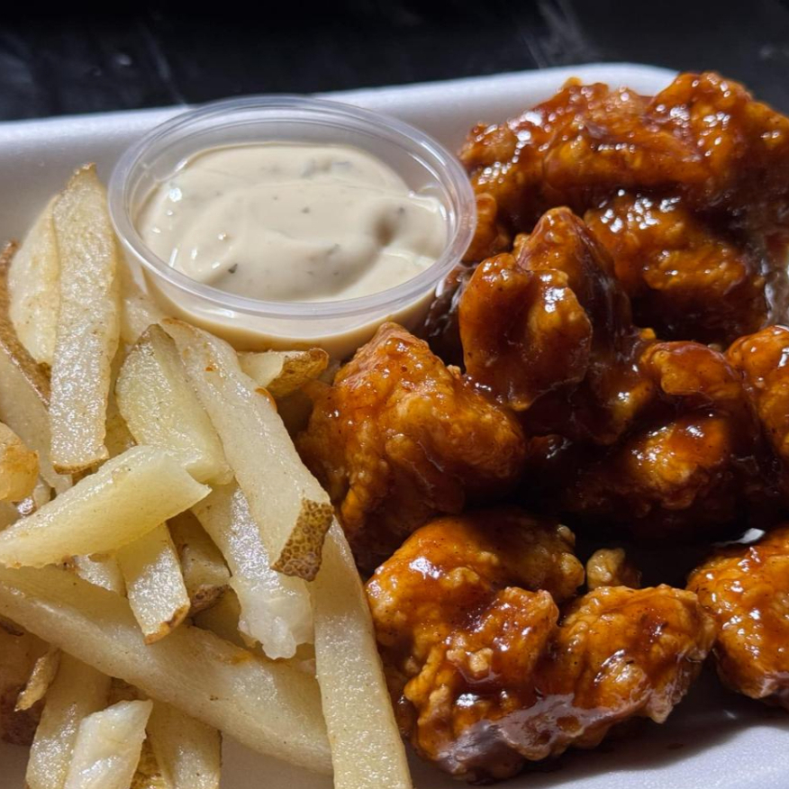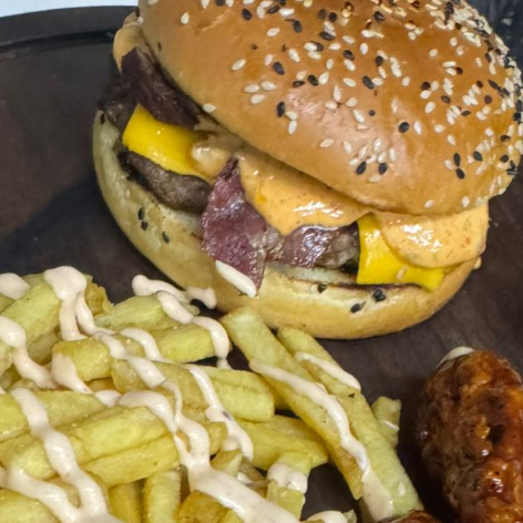Hamburguesa con papas y porción de boneless