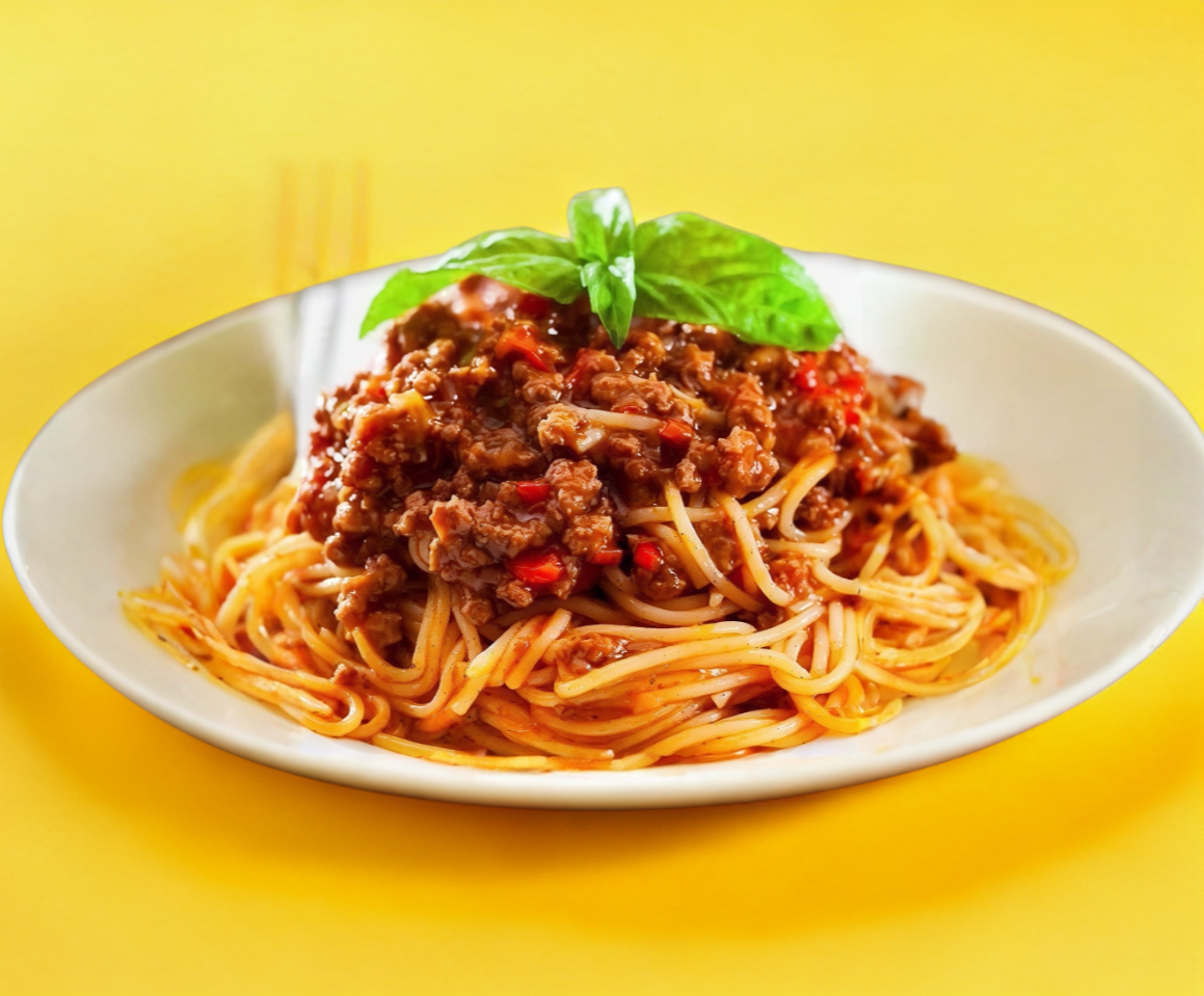 Espagueti estilo boloñesa acompañado de ensalada verde.