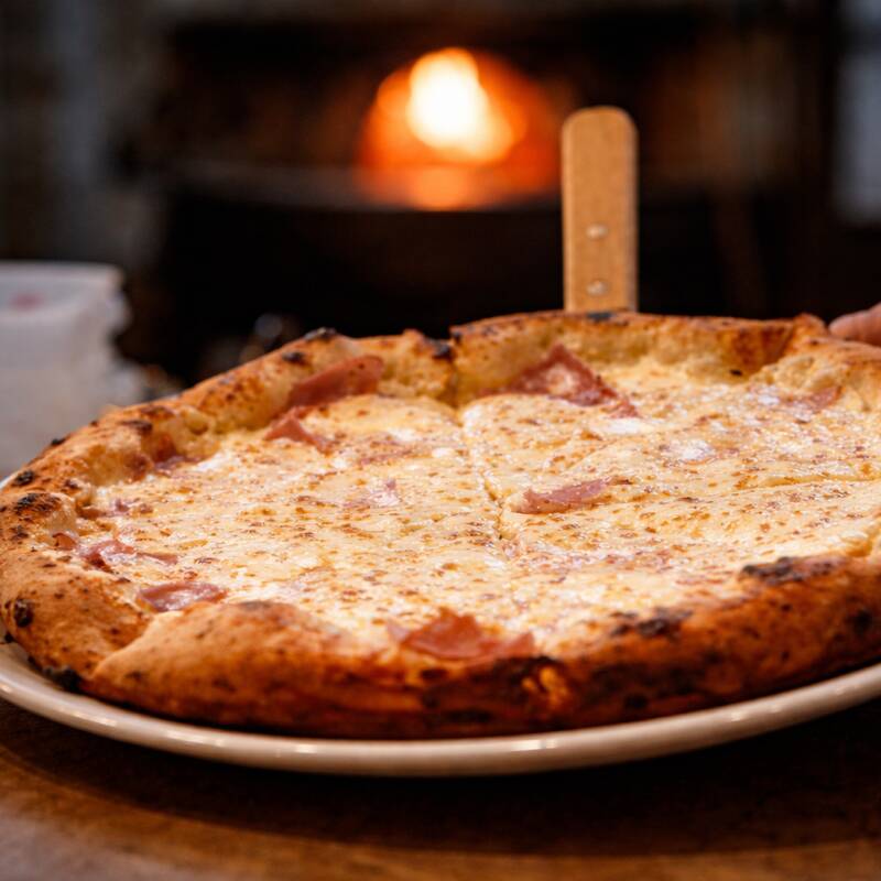 Base blanca cremosa de ajo, jamón premium y mozzarella fundida