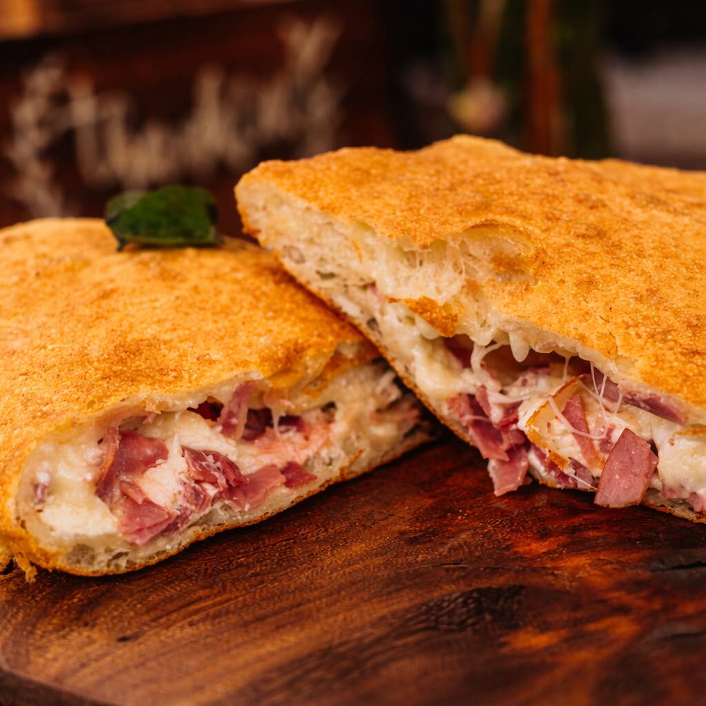 Rellena de queso ricotta, mozzarella, salame, jamón de pierna de cerdo y un toque de pimienta negra
