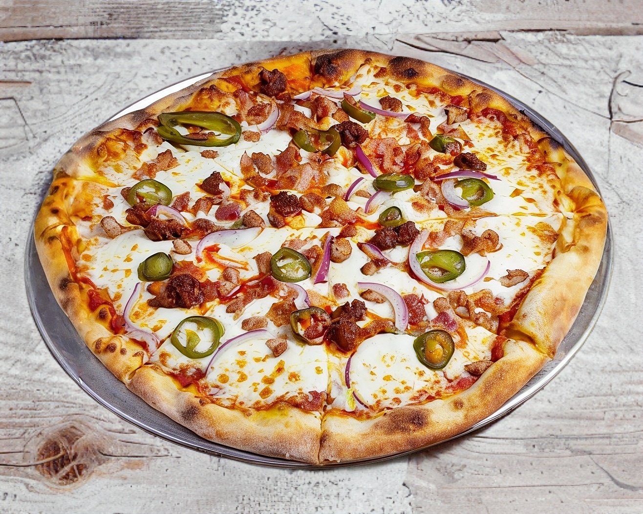 Salsa de tomate, queso mozzarella, chorizo, cebolla, frijol, tocino, jalapeños y crema de chiles gueritos.
