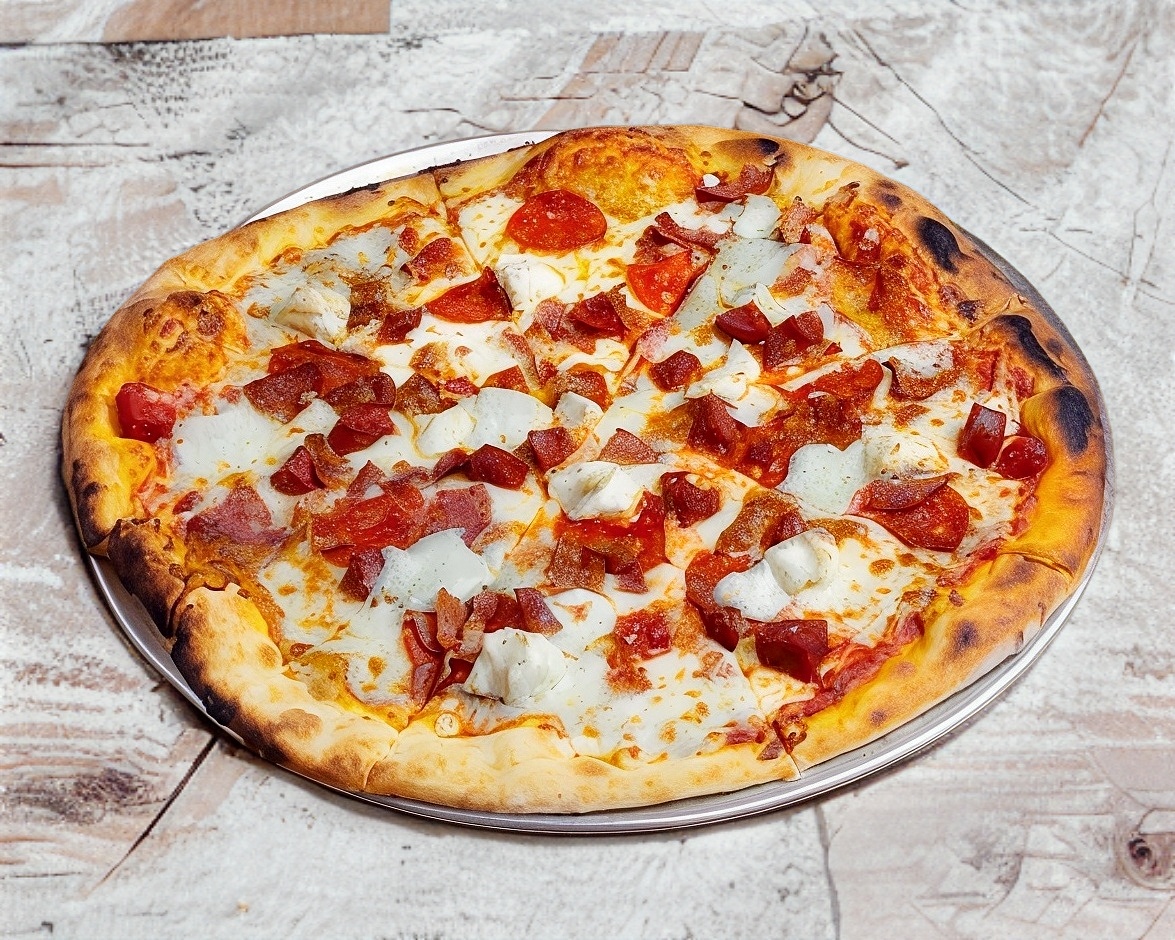 Salsa de tomate, mozzarella, pepperoni, salami, chorizo español y tocino.
