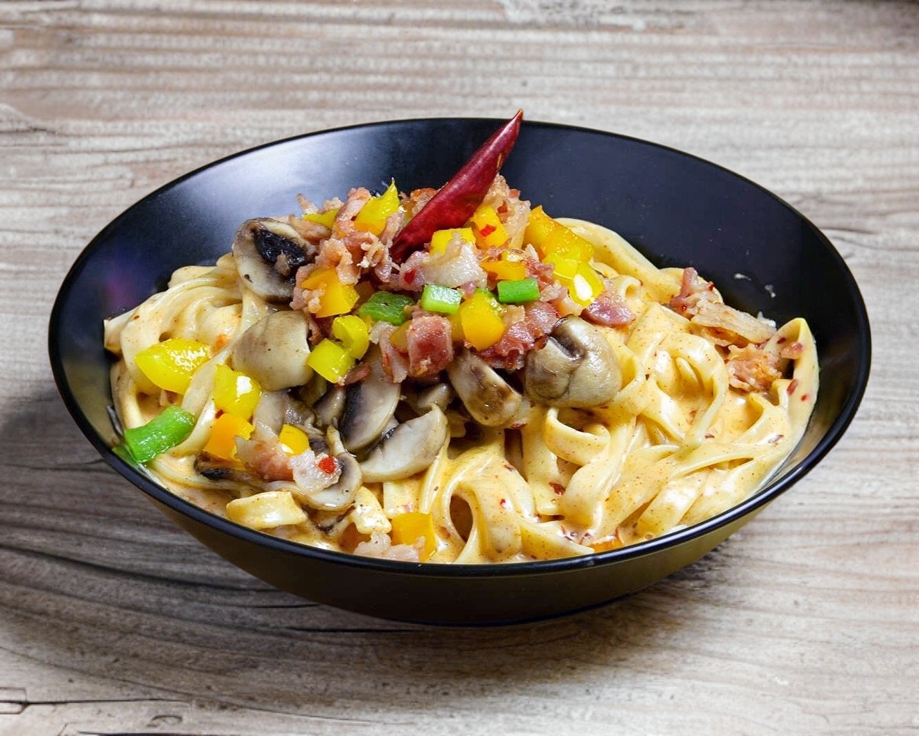 Pasta fettuccine, crema de chile de árbol, champiñon, tocino y morrón.