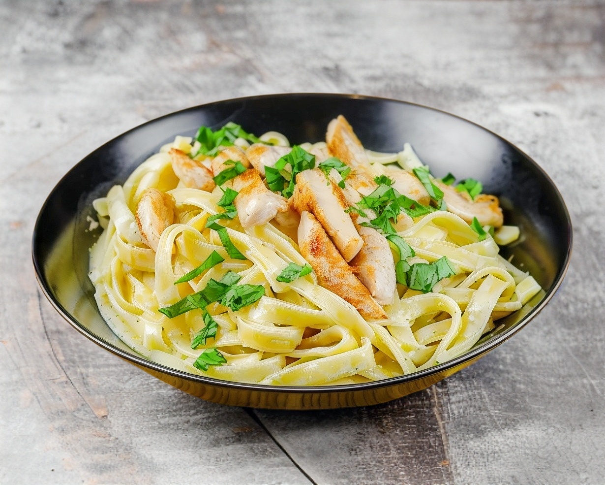 Pechuga, pasta fetuccini con queso parmesano, mantequilla, crema y condimentos.