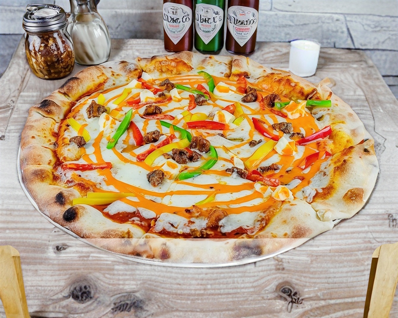 Salsa de tomate, mozzarella, pollo crujiente, queso crema, morrón y salsa de la casa.