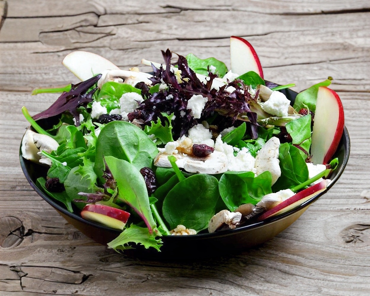 Ensalada de la casa con lechuga mixta, nuez, queso feta, arándanos, champiñones y manzana.