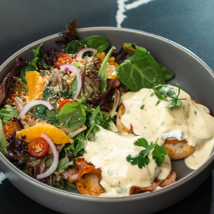 English Muffins, huevos pochados, salsa holandesa, espárrago con proteína a elegir: Tocino, jamón o prosciutto.