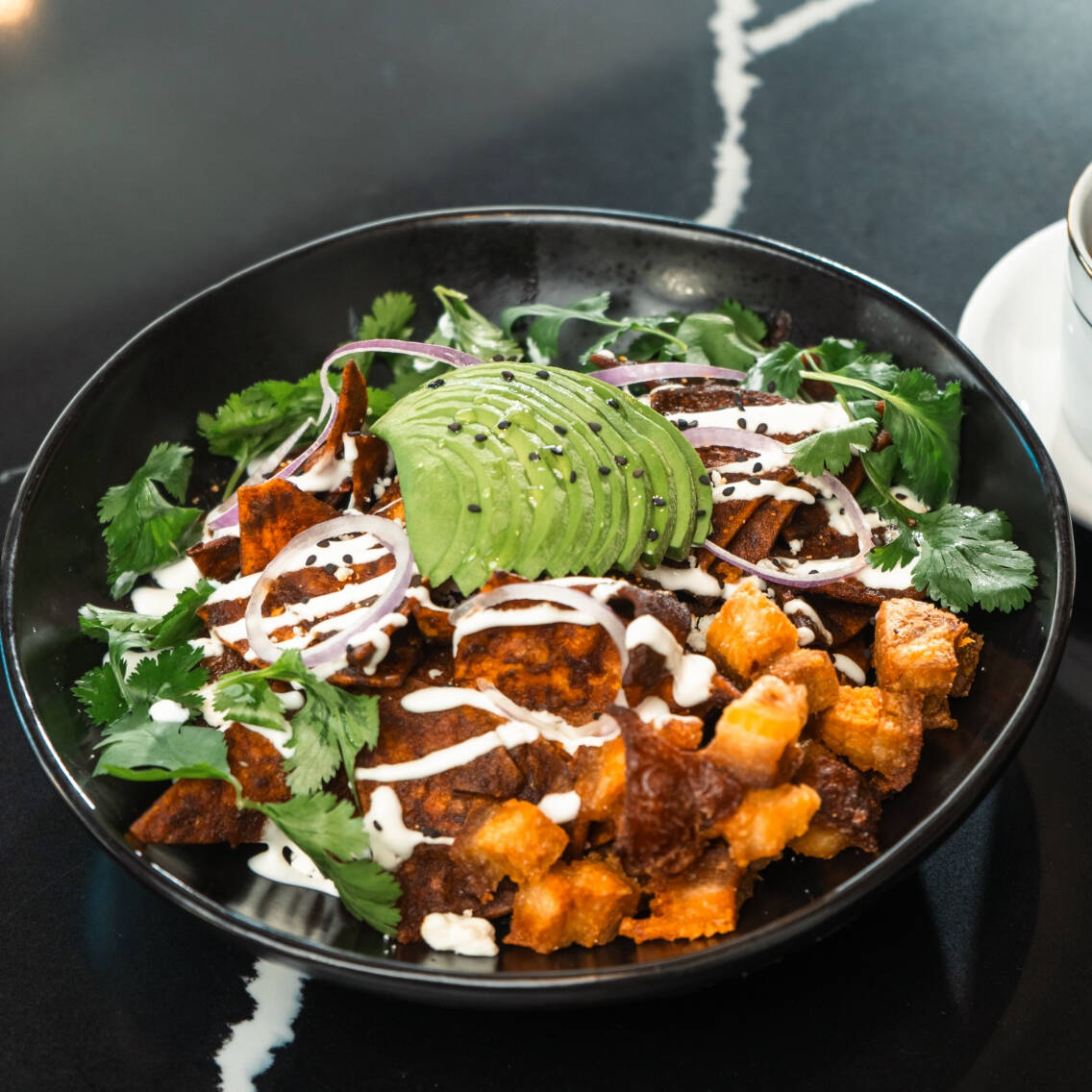 Queso fresco, cebolla curtida, aguacate, crema ácida y cilantro.